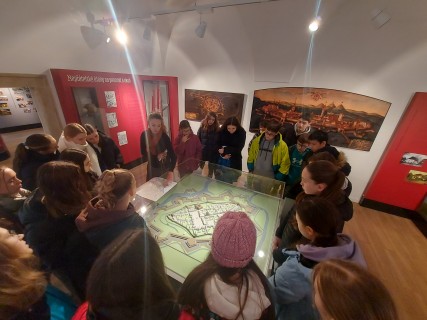 Žáci byli během prohlídky provázeni průvodkyní expozice a dozvěděli se například kde stál pranýř, jaká tady byla řemesla, jaké bylo opevnění Uherského Hradiště, kdo je patronem města, co to byla rechla, palečnice, cejch, kde stál kostel sv. Jiří atd....