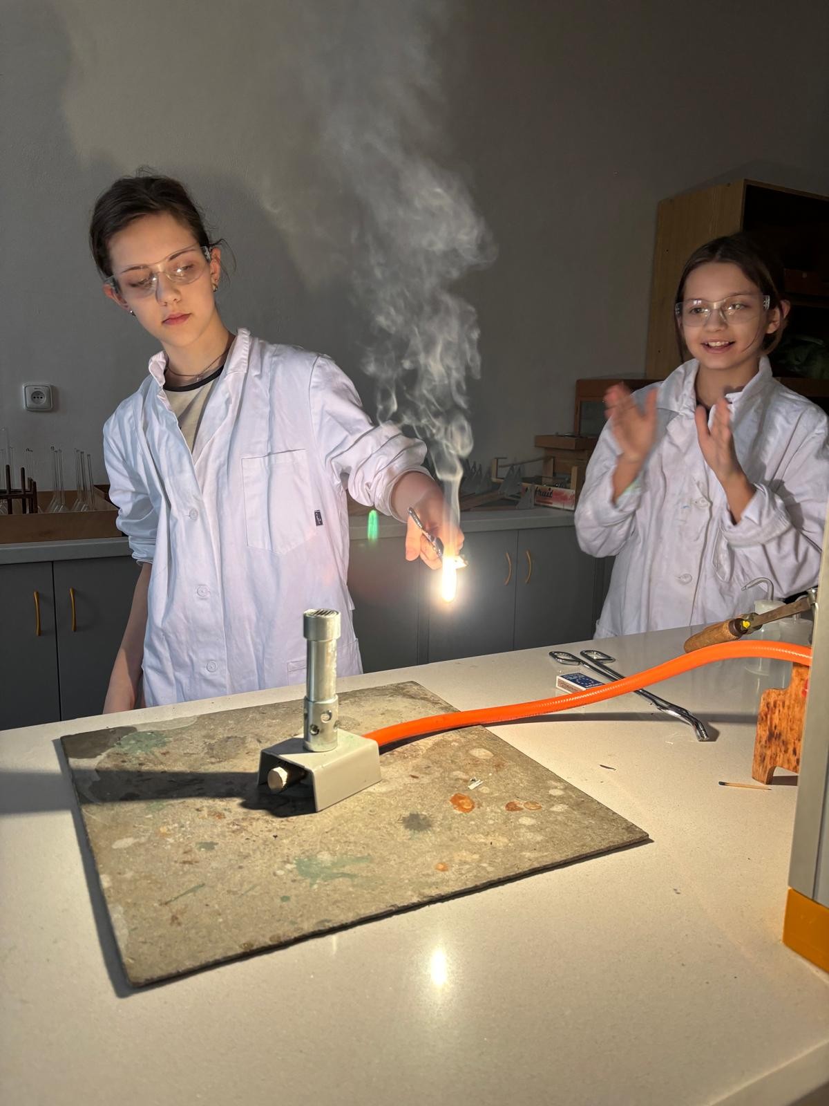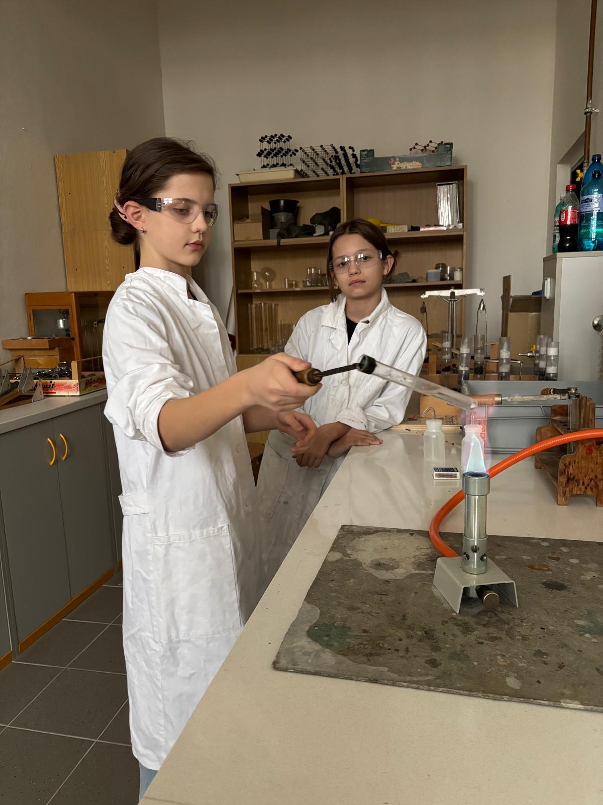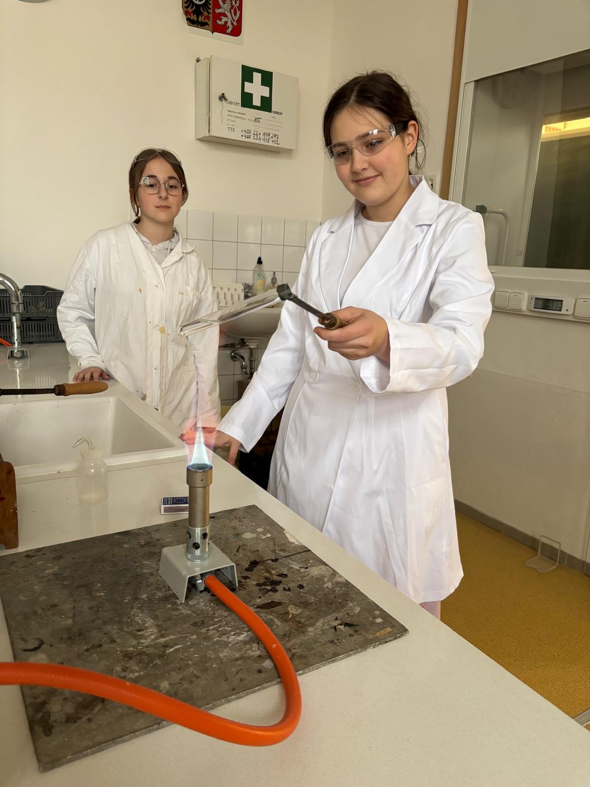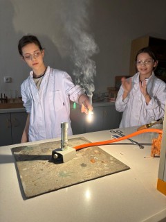 Při naší první schůzce jsme se naučili pracovat s plynovým kahanem, seznámili jsme se s postupem správného zahřívání látek nad plamenem a vyzkoušeli jsme si hoření hořčíku.