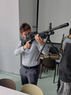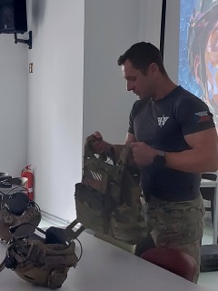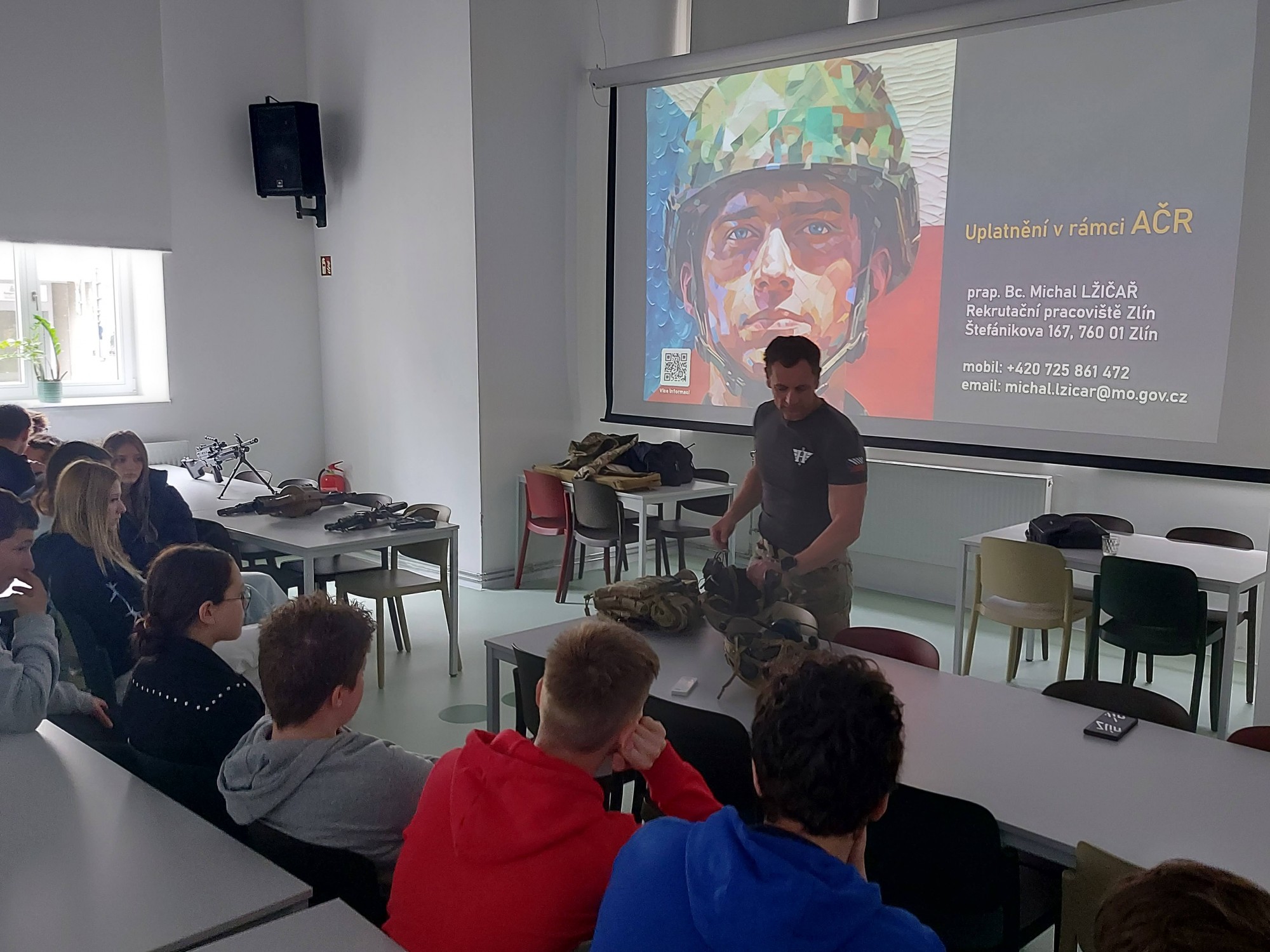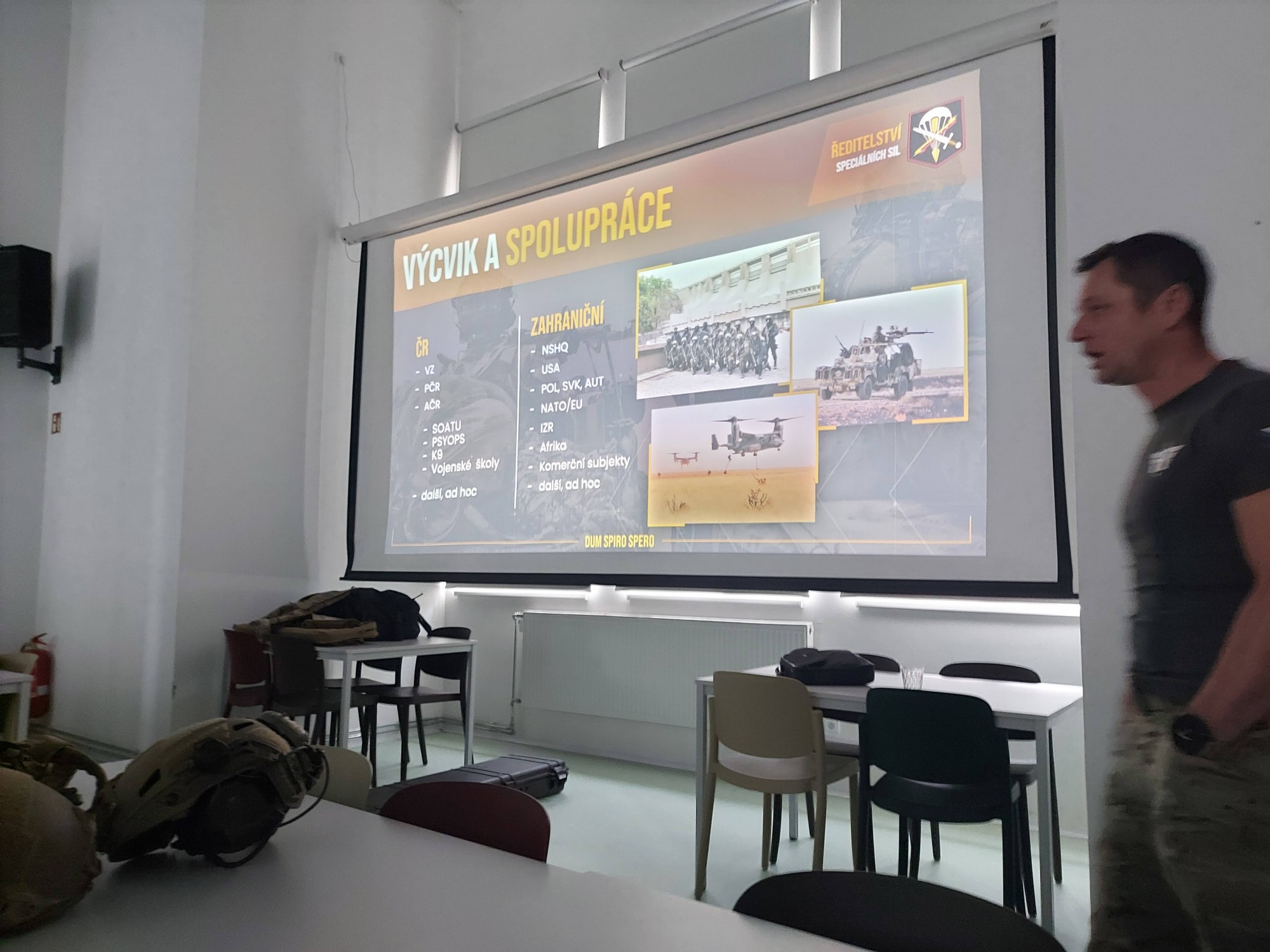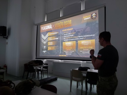 V úvodní části byli žáci detailně seznámeni se strukturou, činností, výzbrojí a výstrojí této elitní jednotky Armády České republiky, včetně informací o průběhu přijímacího řízení.
