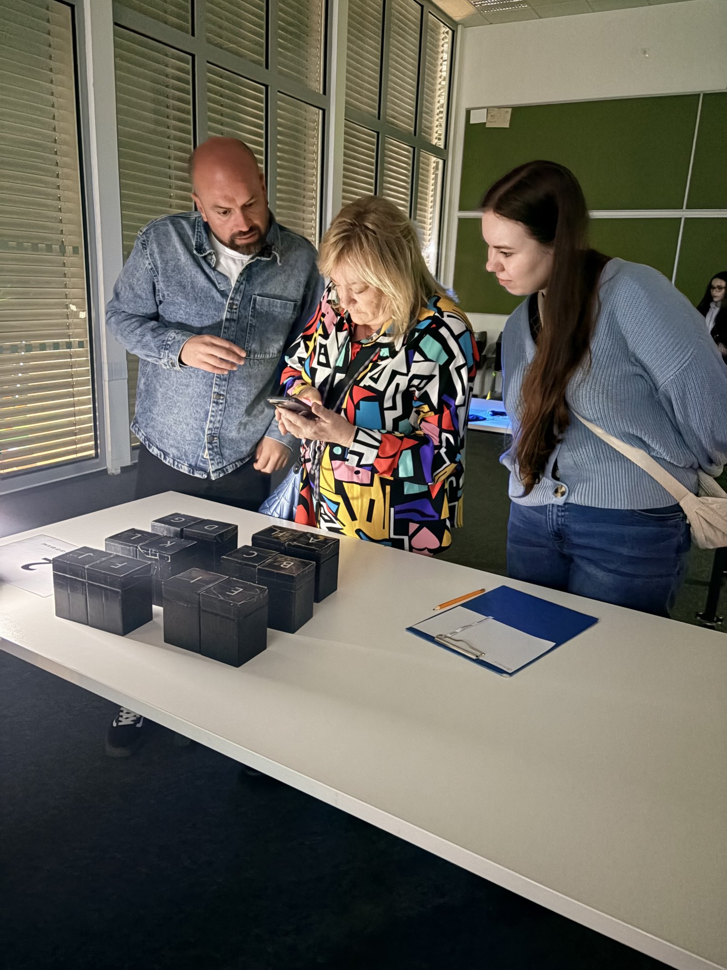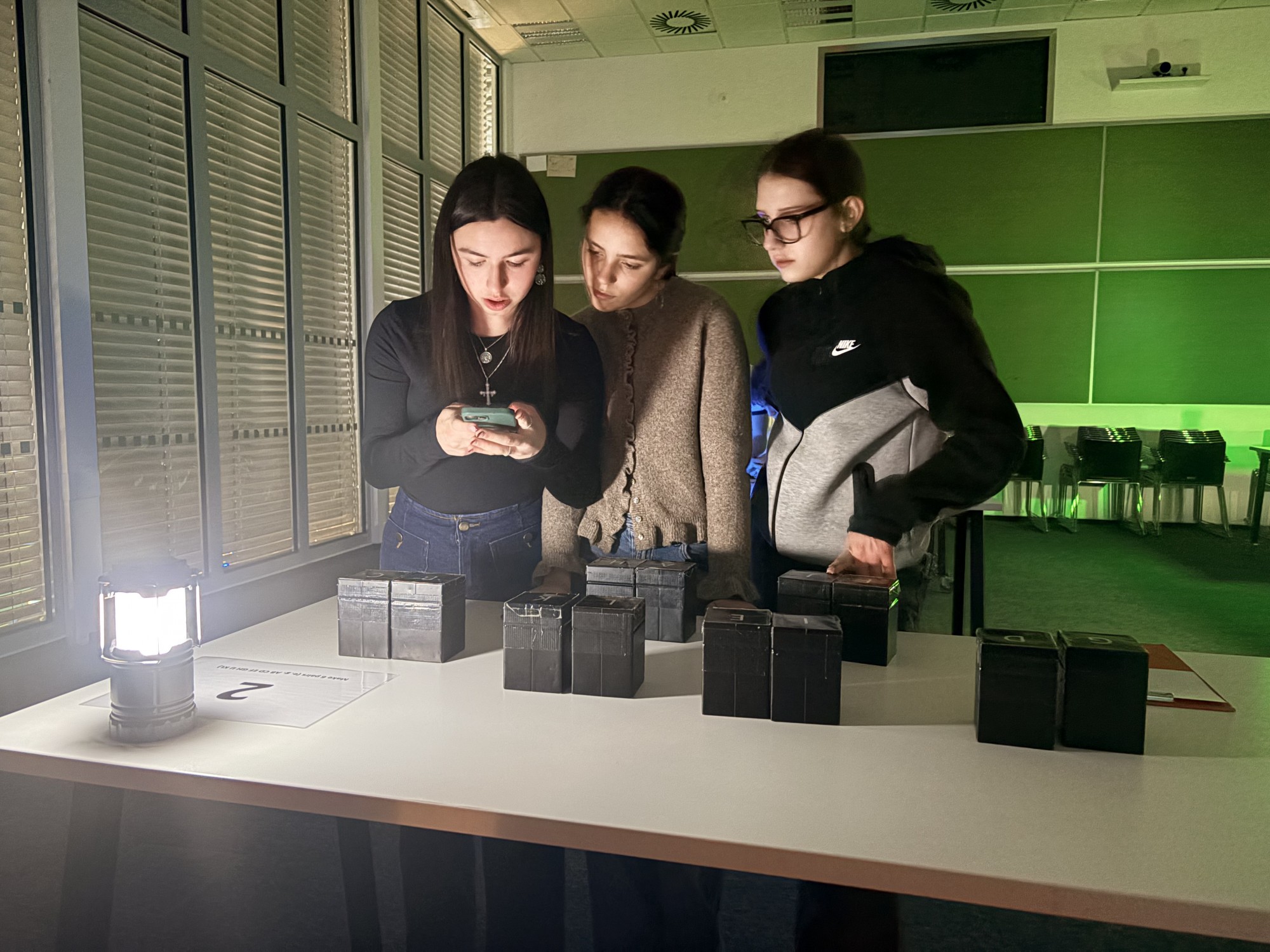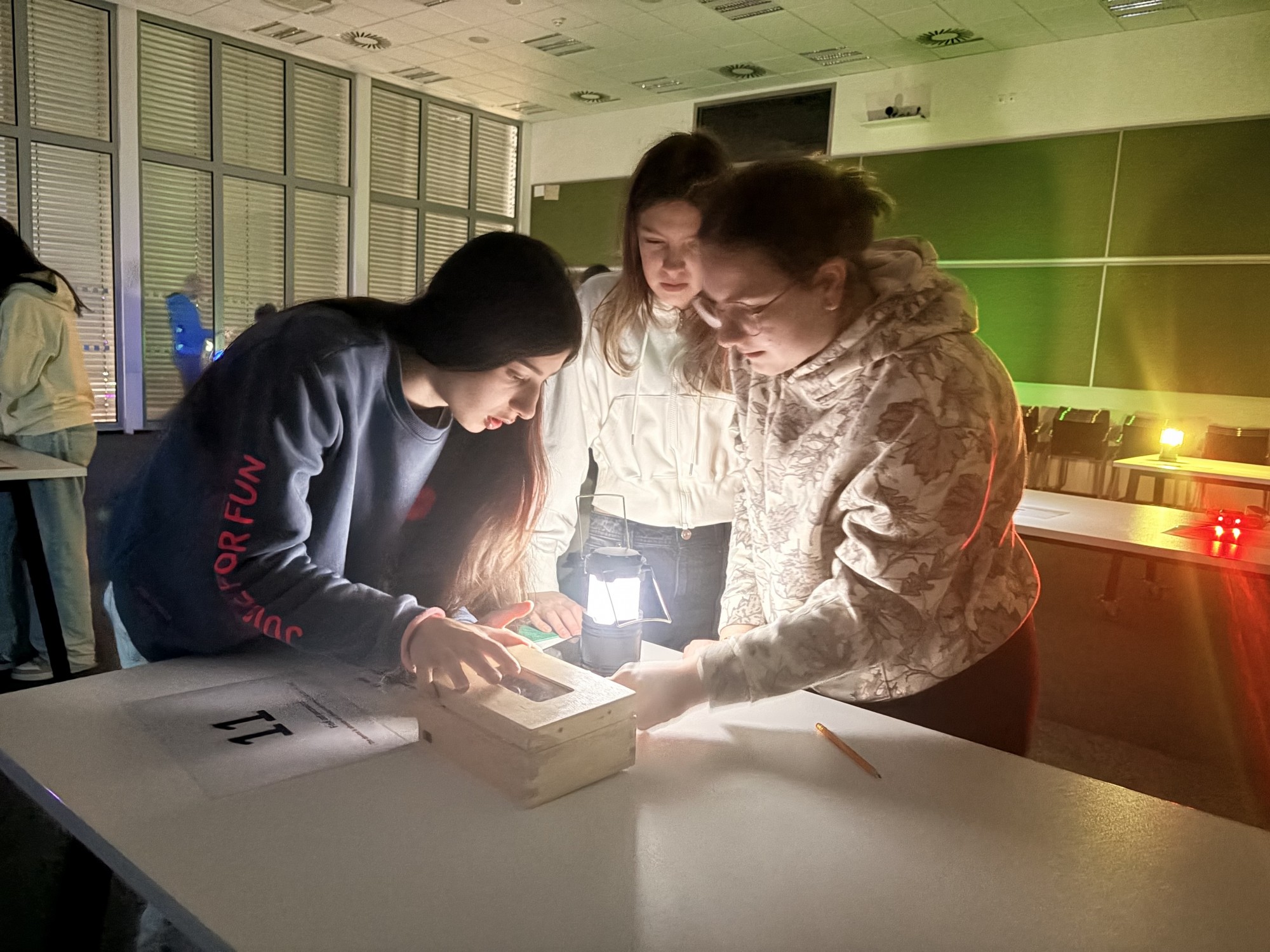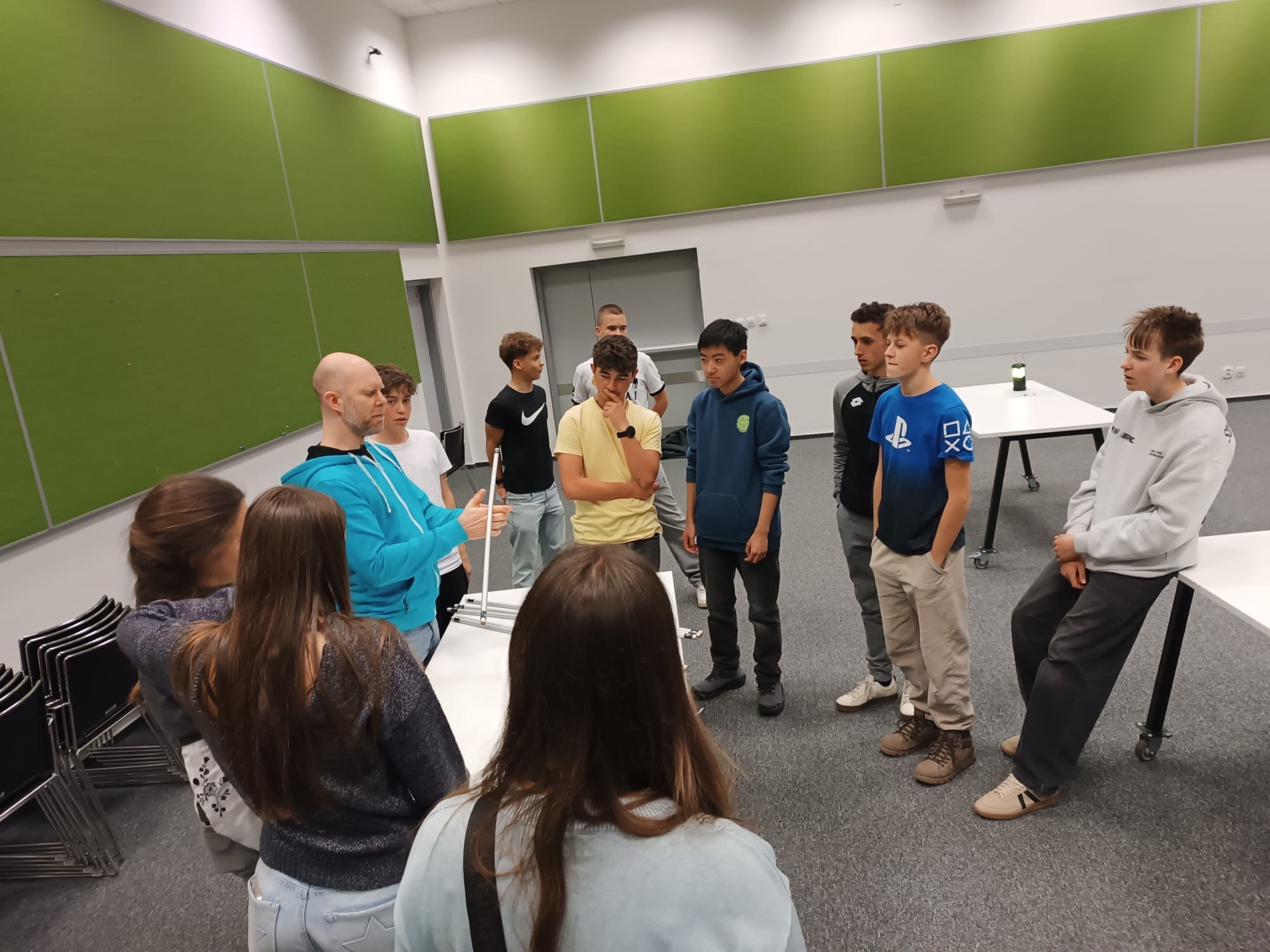 Zde na nás čekal objednaný výukový program – úniková hra v angličtině. Žáci se rozdělili do skupinek po třech a pustili se do řešení různorodých úkolů zaměřených na fyziku, chemii, logiku i smyslové vnímání. K zaznamenávání odpovědí využívali své mobilní telefony. Každá skupina musela vyřešit alespoň 10 z celkových 13 úkolů, aby mohla „uniknout“. Všichni se do aktivity zapojili s velkým nadšením a spolupráce mezi českými a španělskými žáky fungovala skvěle.