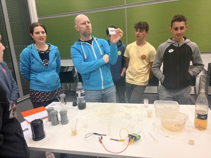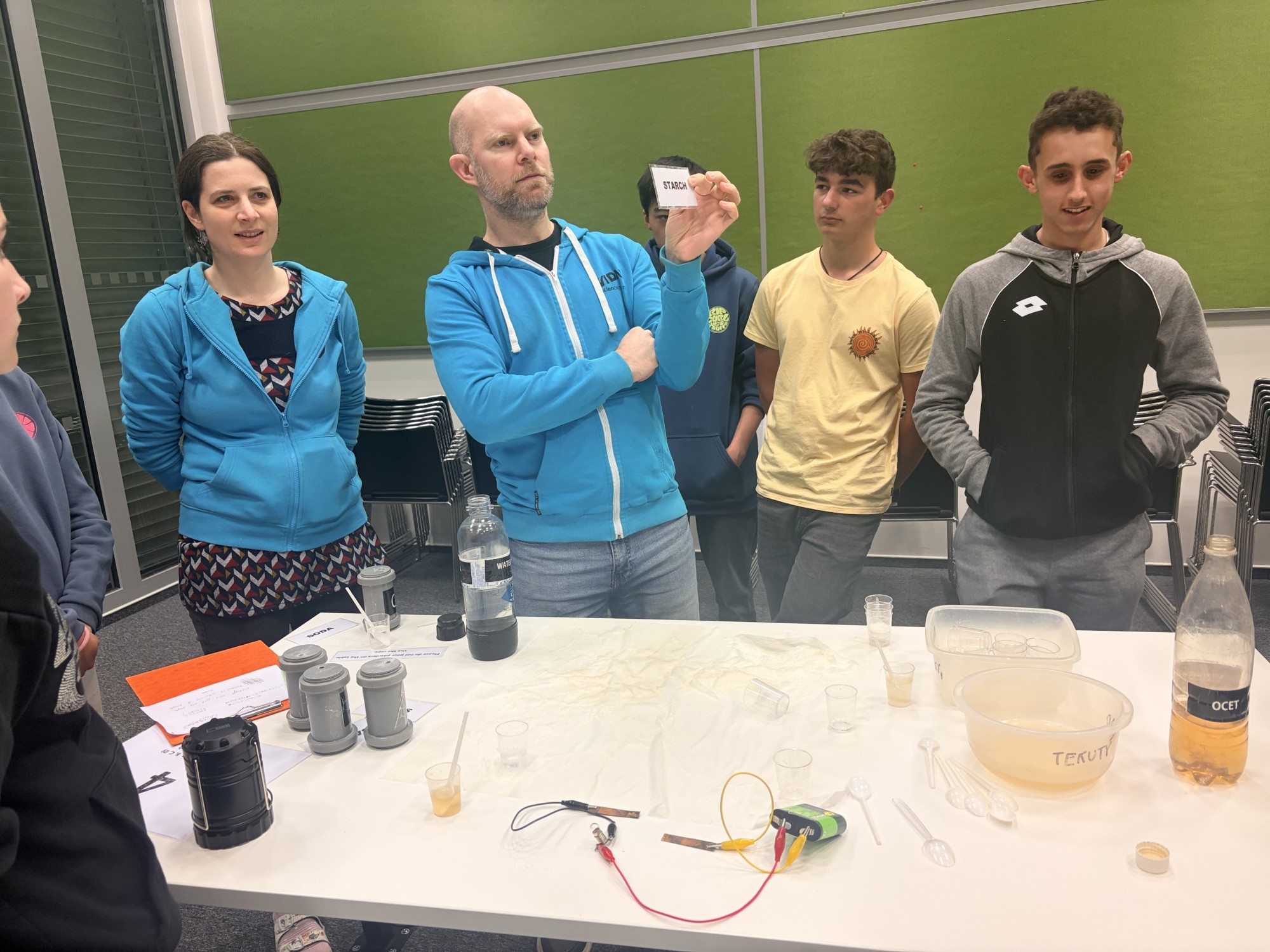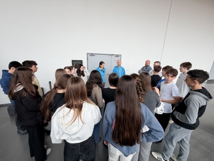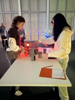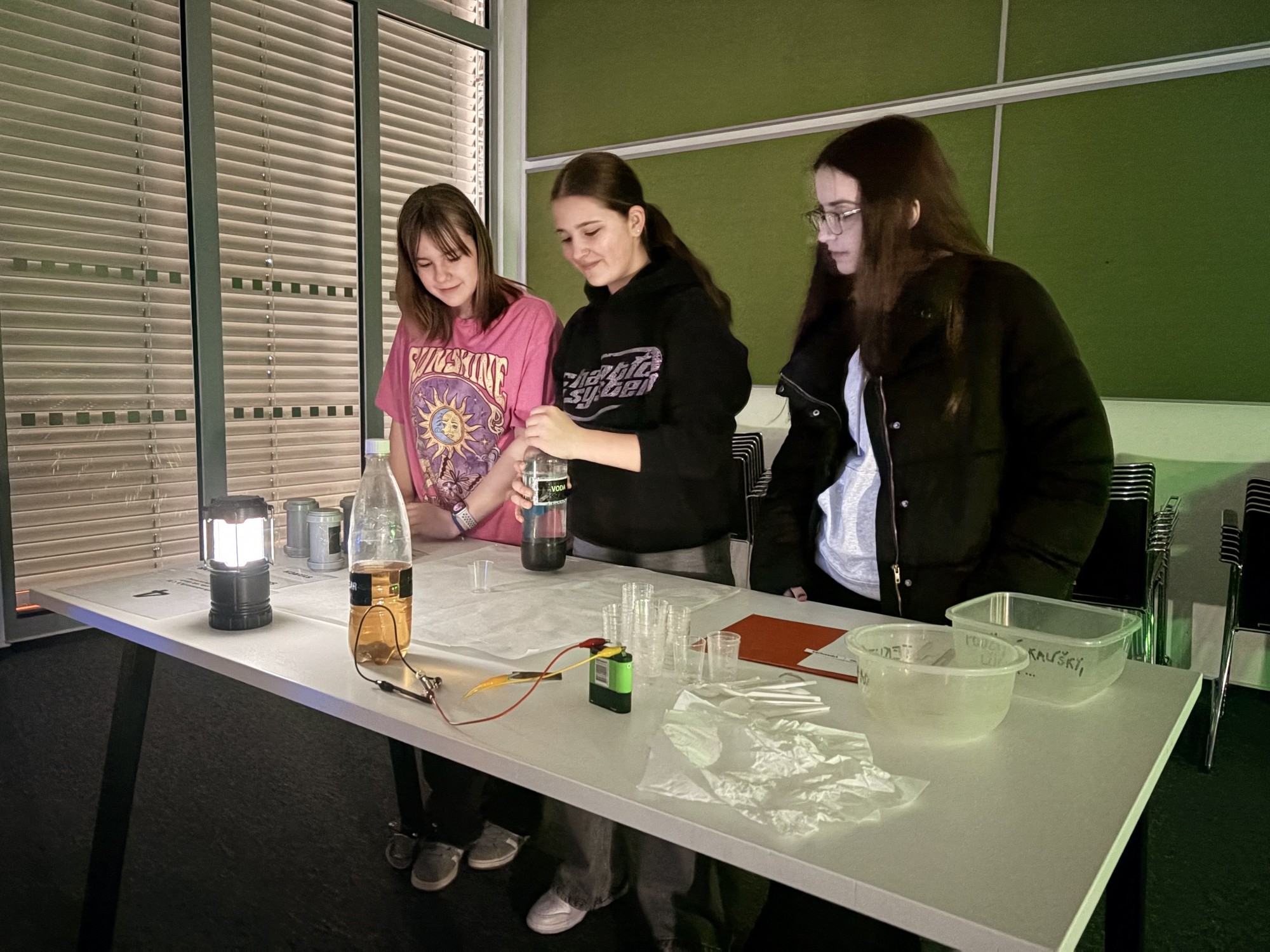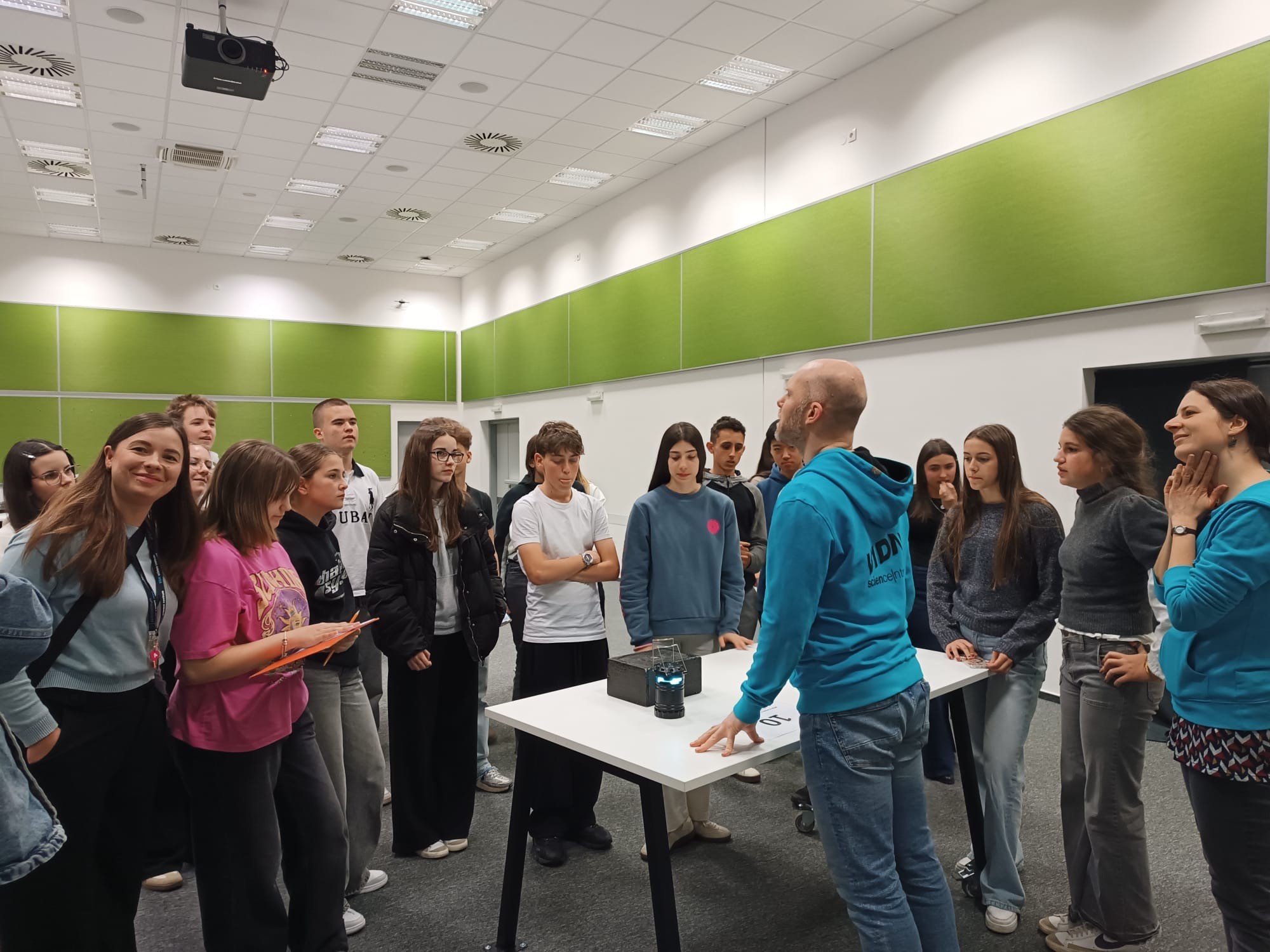 Zde na nás čekal objednaný výukový program – úniková hra v angličtině. Žáci se rozdělili do skupinek po třech a pustili se do řešení různorodých úkolů zaměřených na fyziku, chemii, logiku i smyslové vnímání. K zaznamenávání odpovědí využívali své mobilní telefony. Každá skupina musela vyřešit alespoň 10 z celkových 13 úkolů, aby mohla „uniknout“. Všichni se do aktivity zapojili s velkým nadšením a spolupráce mezi českými a španělskými žáky fungovala skvěle.