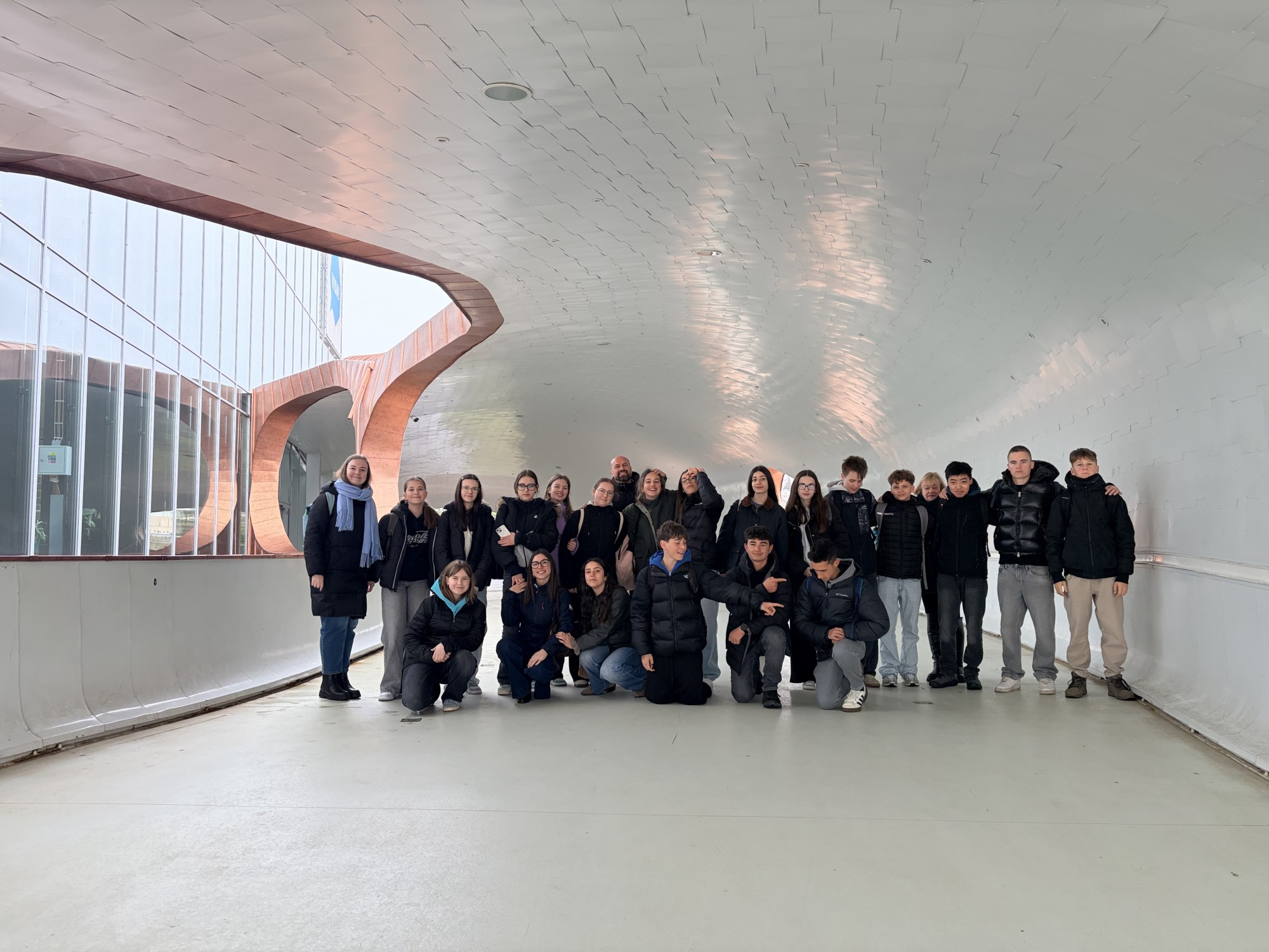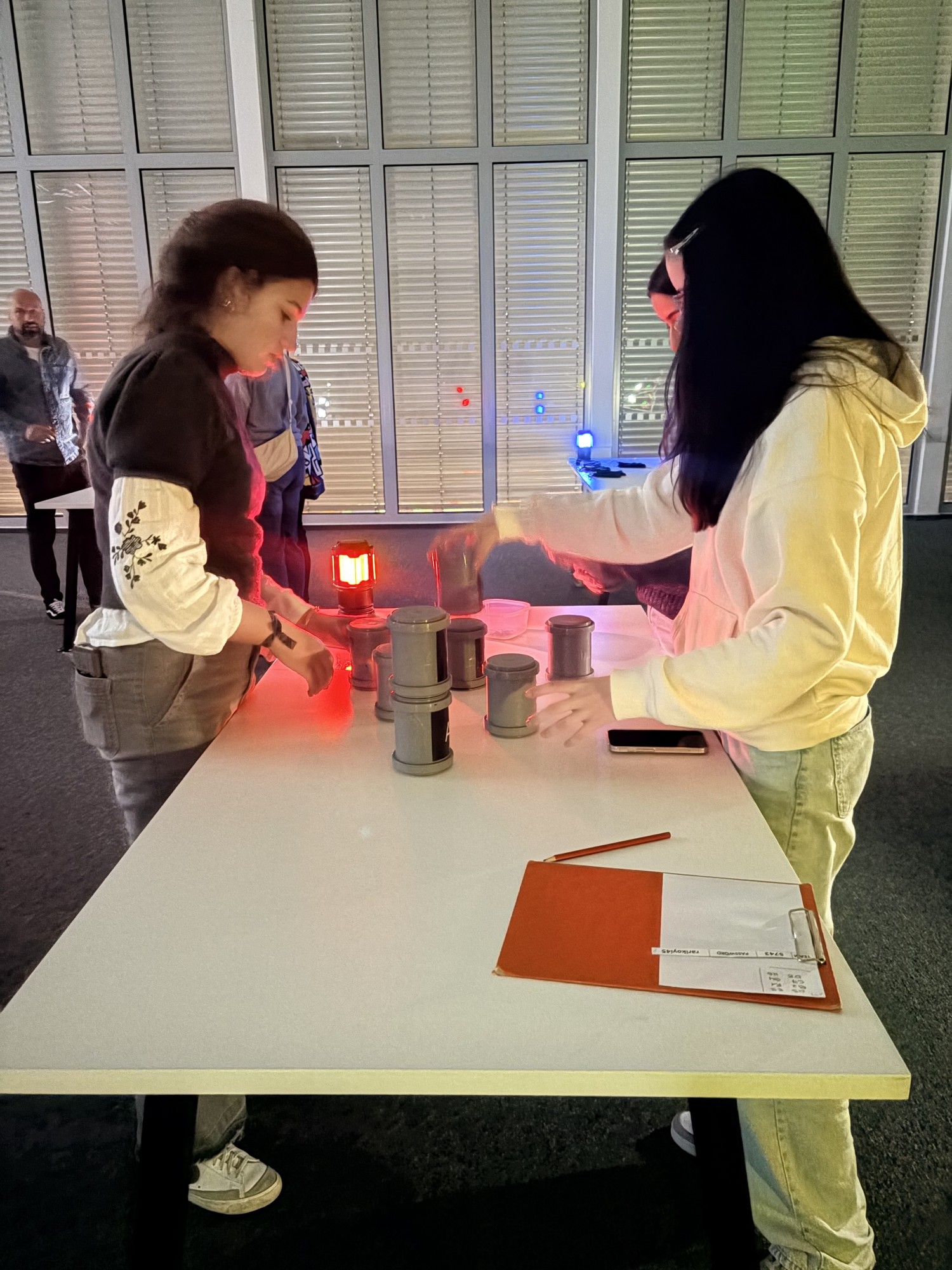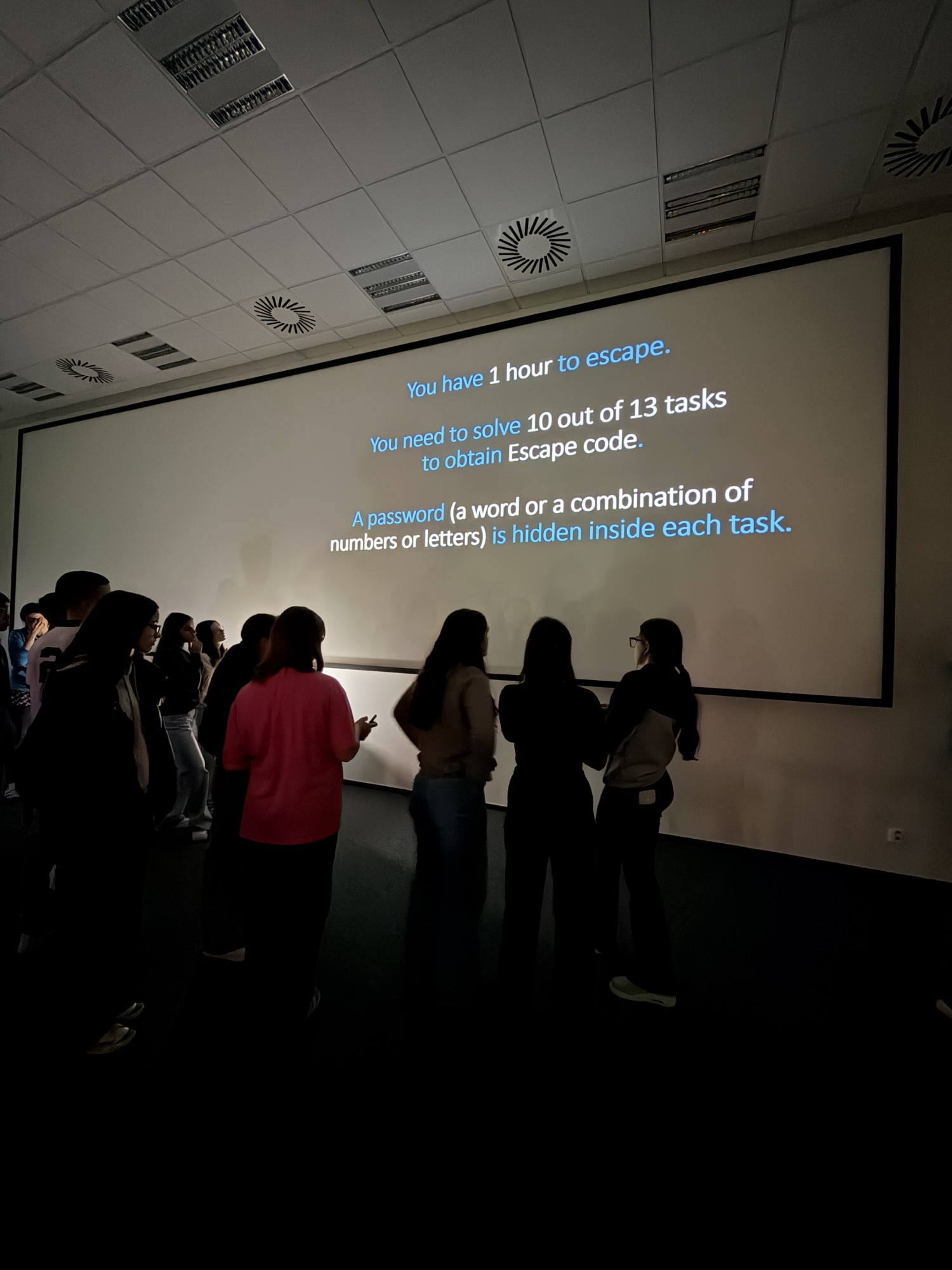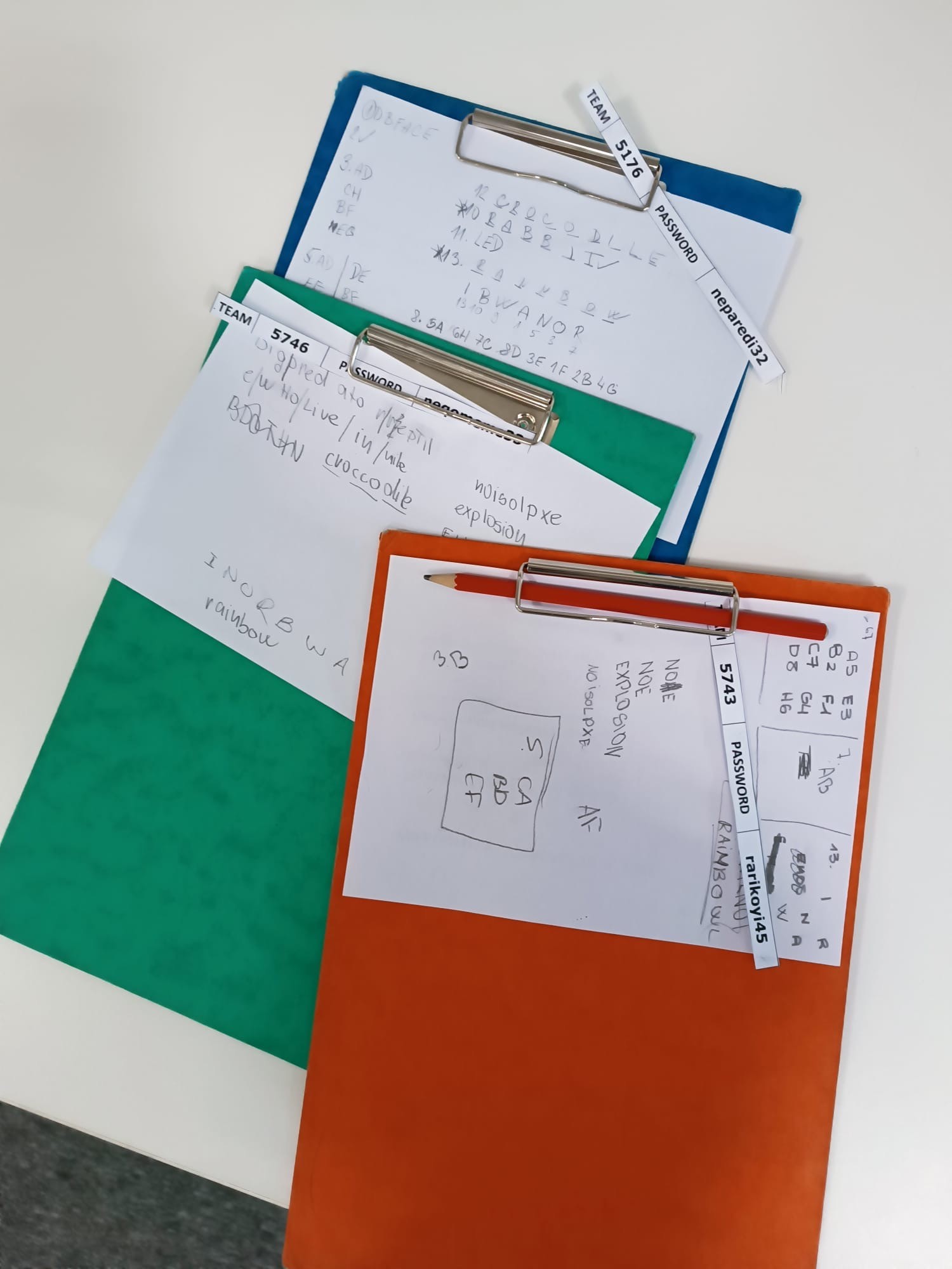 Zde na nás čekal objednaný výukový program – úniková hra v angličtině. Žáci se rozdělili do skupinek po třech a pustili se do řešení různorodých úkolů zaměřených na fyziku, chemii, logiku i smyslové vnímání. K zaznamenávání odpovědí využívali své mobilní telefony. Každá skupina musela vyřešit alespoň 10 z celkových 13 úkolů, aby mohla „uniknout“. Všichni se do aktivity zapojili s velkým nadšením a spolupráce mezi českými a španělskými žáky fungovala skvěle.