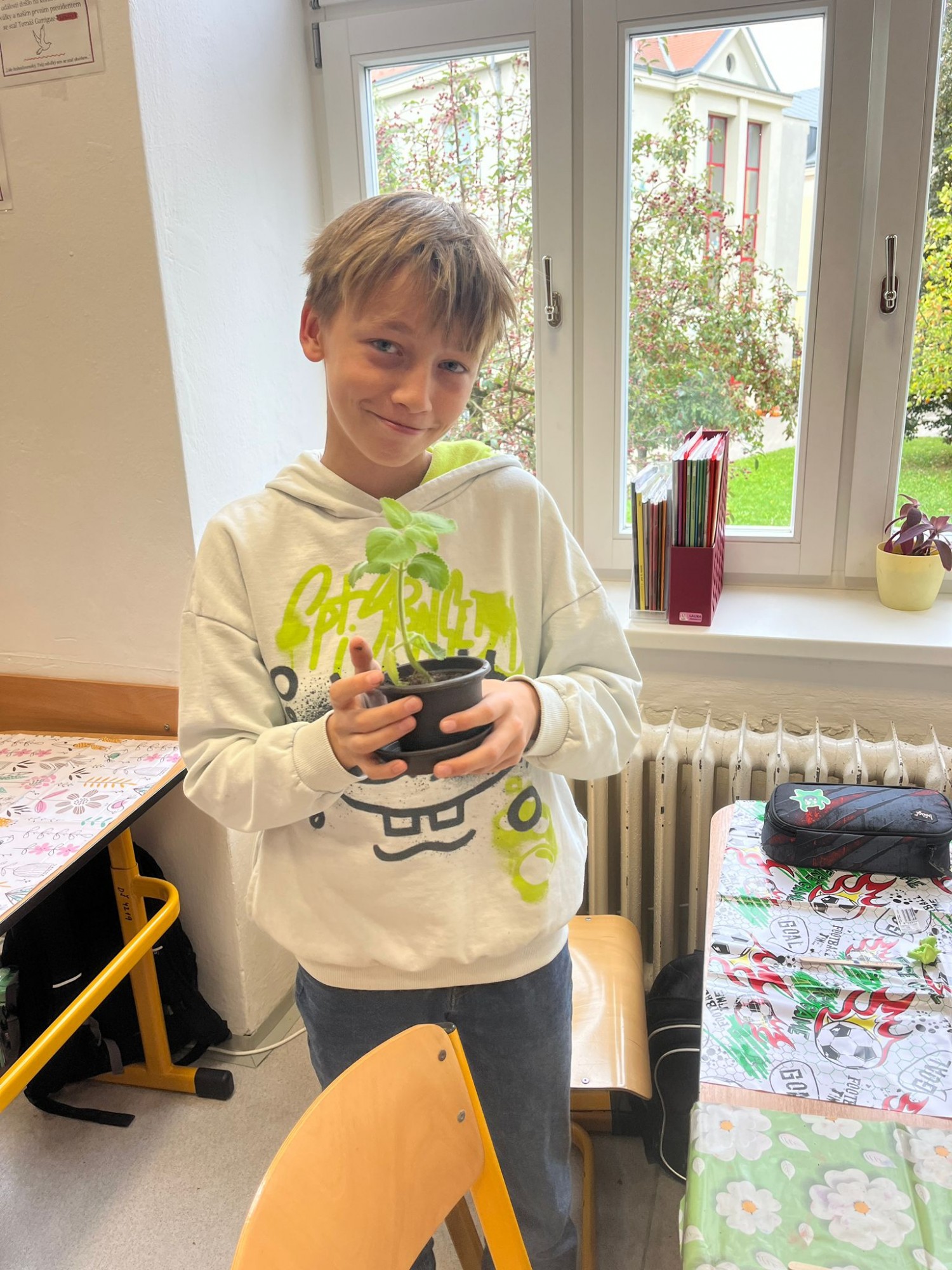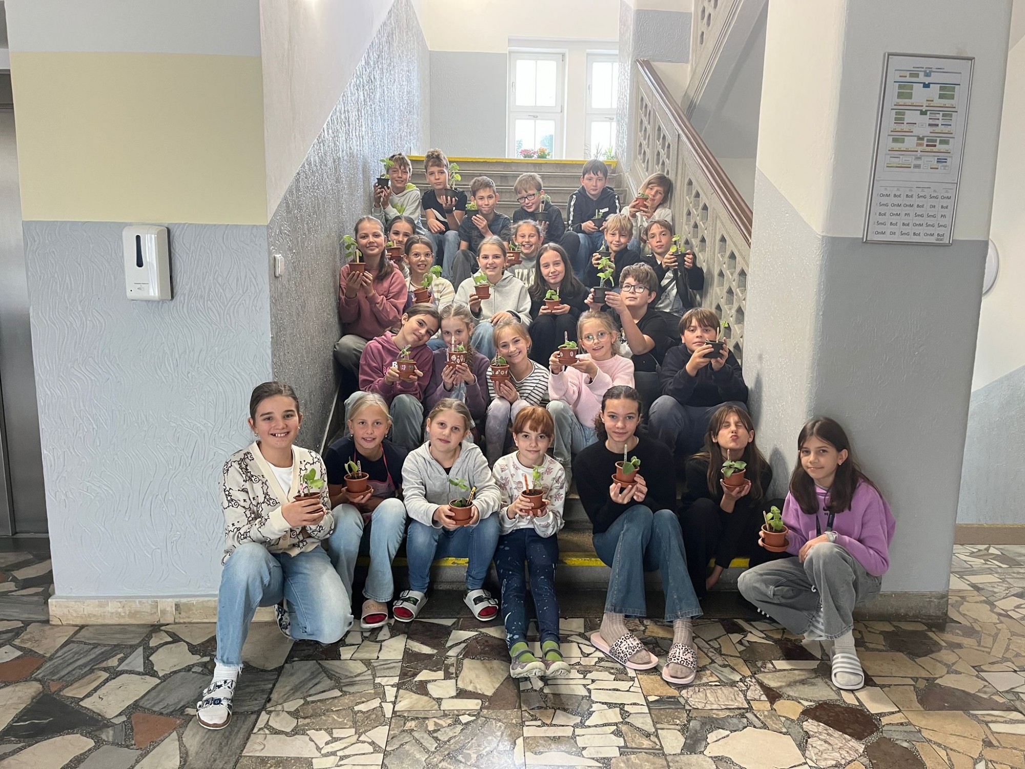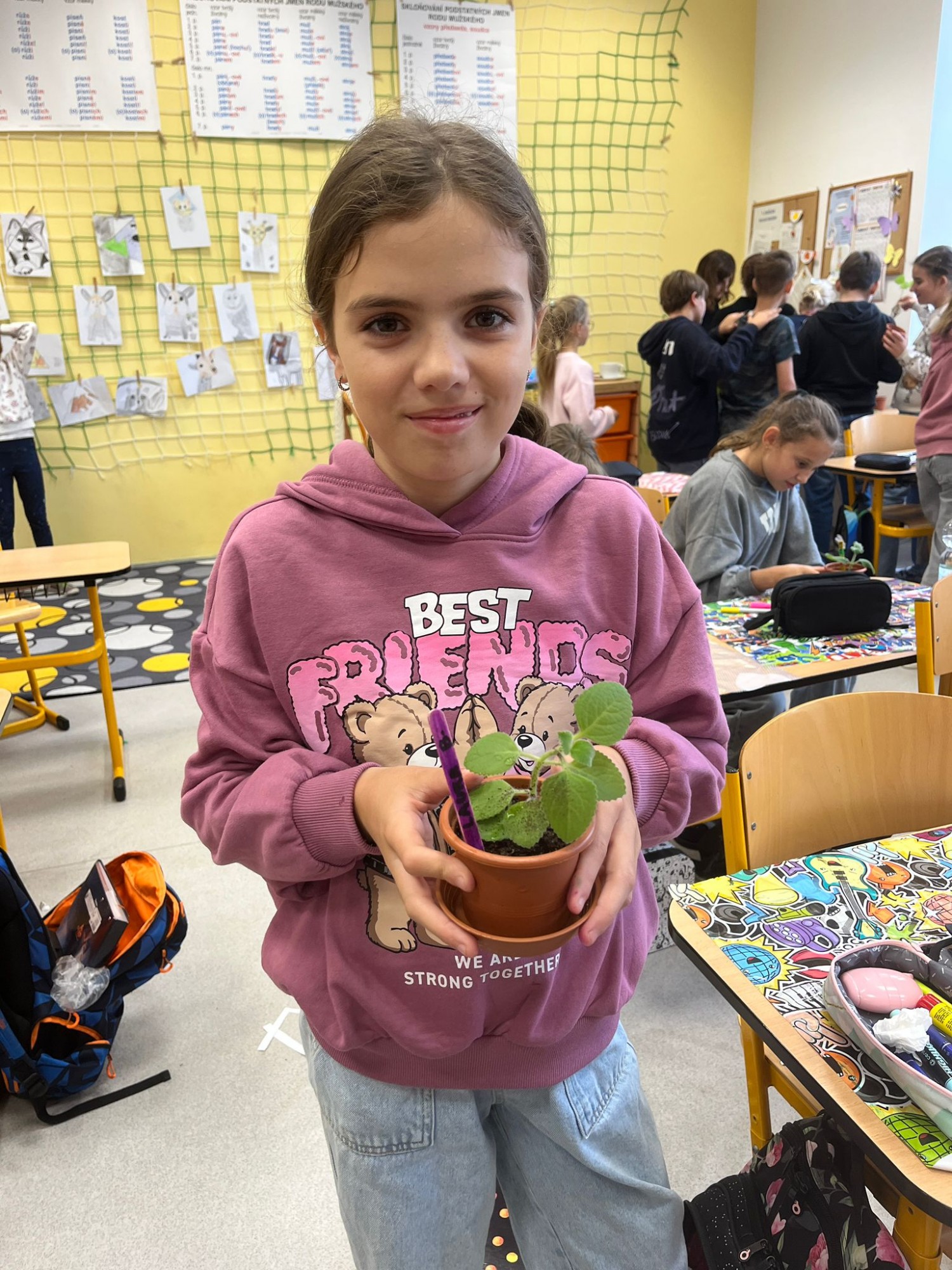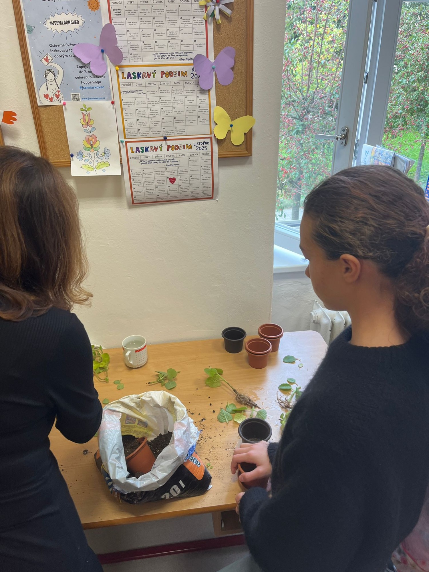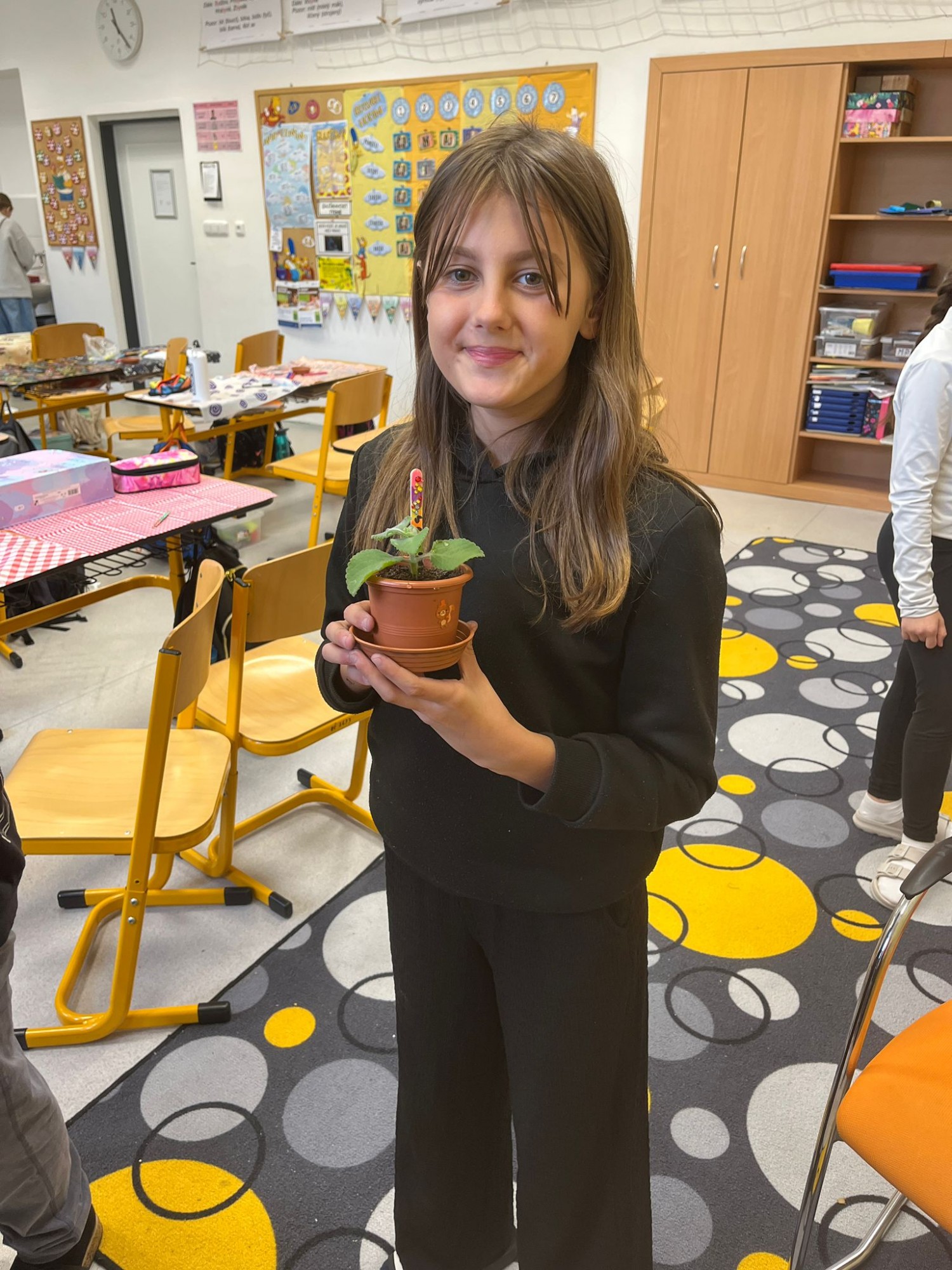 Každý žák si do svého květináčku zasadil řízek, který nám laskavě poskytli hodní rodiče a paní asistentka. Od této chvíle se každý stává „malým pěstitelem“ a bude mít za úkol o svou rostlinku pečovat. Rýmovník je nejen krásná pokojová rostlina, ale navíc voní po mátě a eukalyptu a je známý svými blahodárnými účinky při nachlazení či kašli.