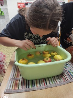 Tato hra má dlouhou tradici v Británii i v USA a spočívá v tom, že se jablka plovoucí v misce s vodou snaží chytit pouze pomocí zubů – bez pomoci rukou. Děti se do soutěže pustily s obrovským nadšením a smíchem. I když to někdy nebylo úplně jednoduché, nakonec se všem podařilo alespoň jedno jablíčko ulovit.