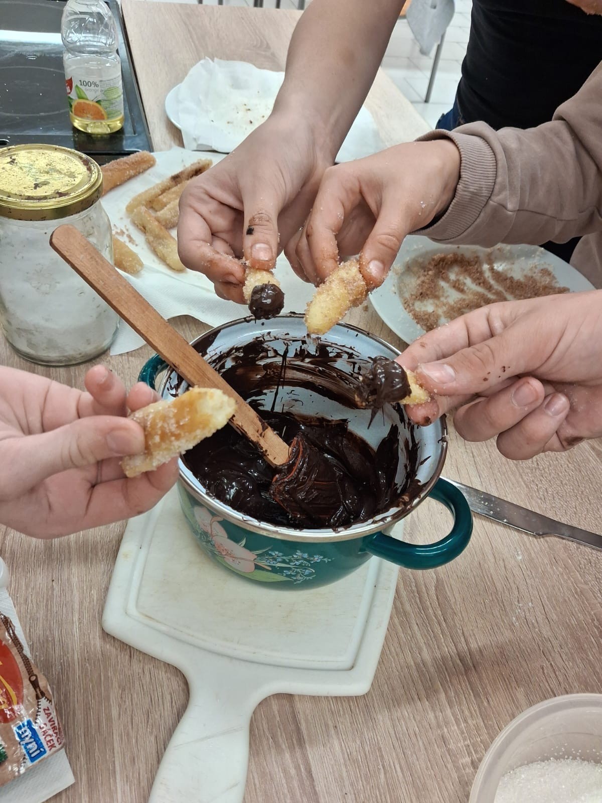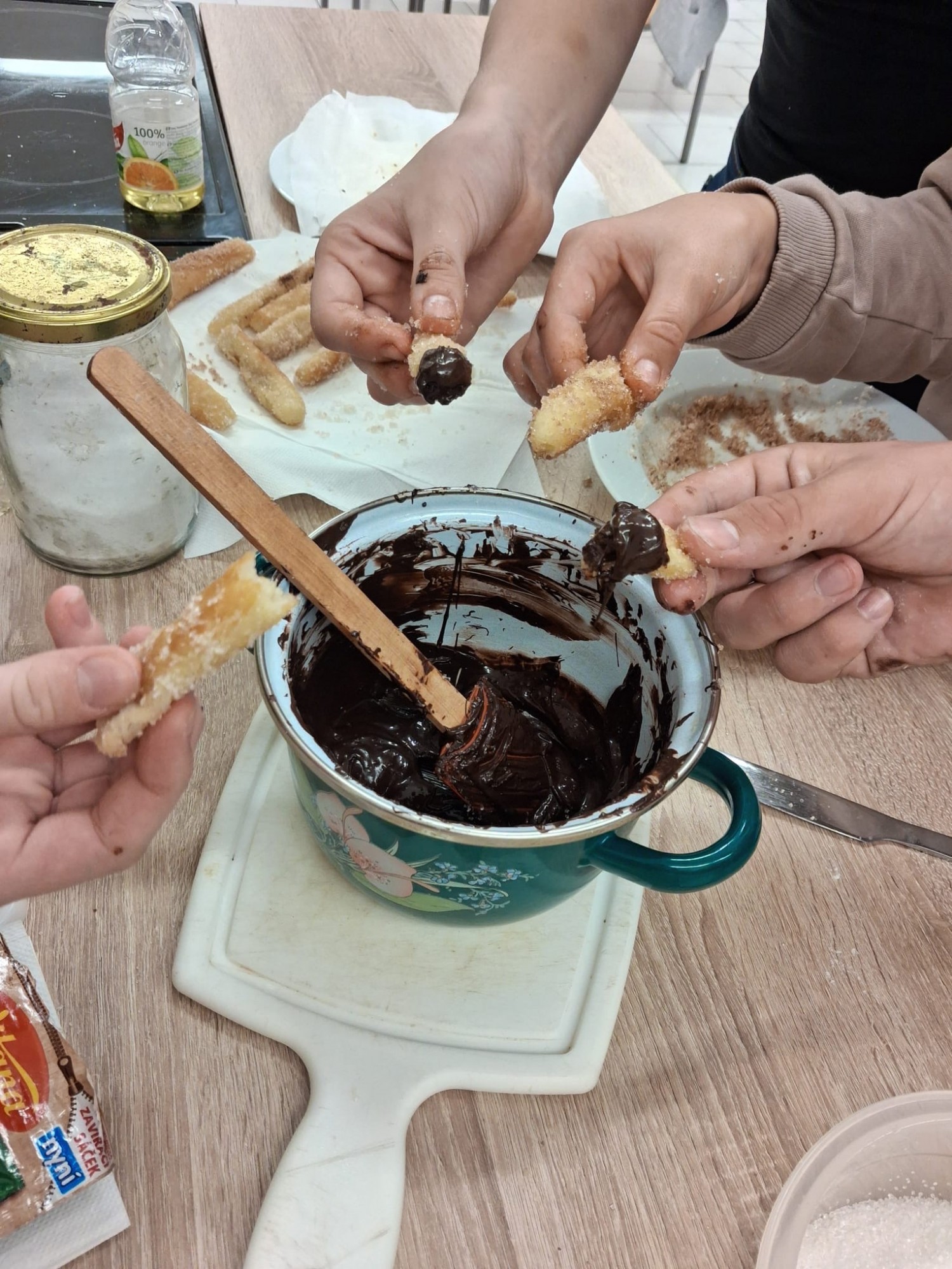 špetka soli, po usmažení se obalí v cukru podle chuti i ve skořici a namáčí se do čokolády, tedy nejen