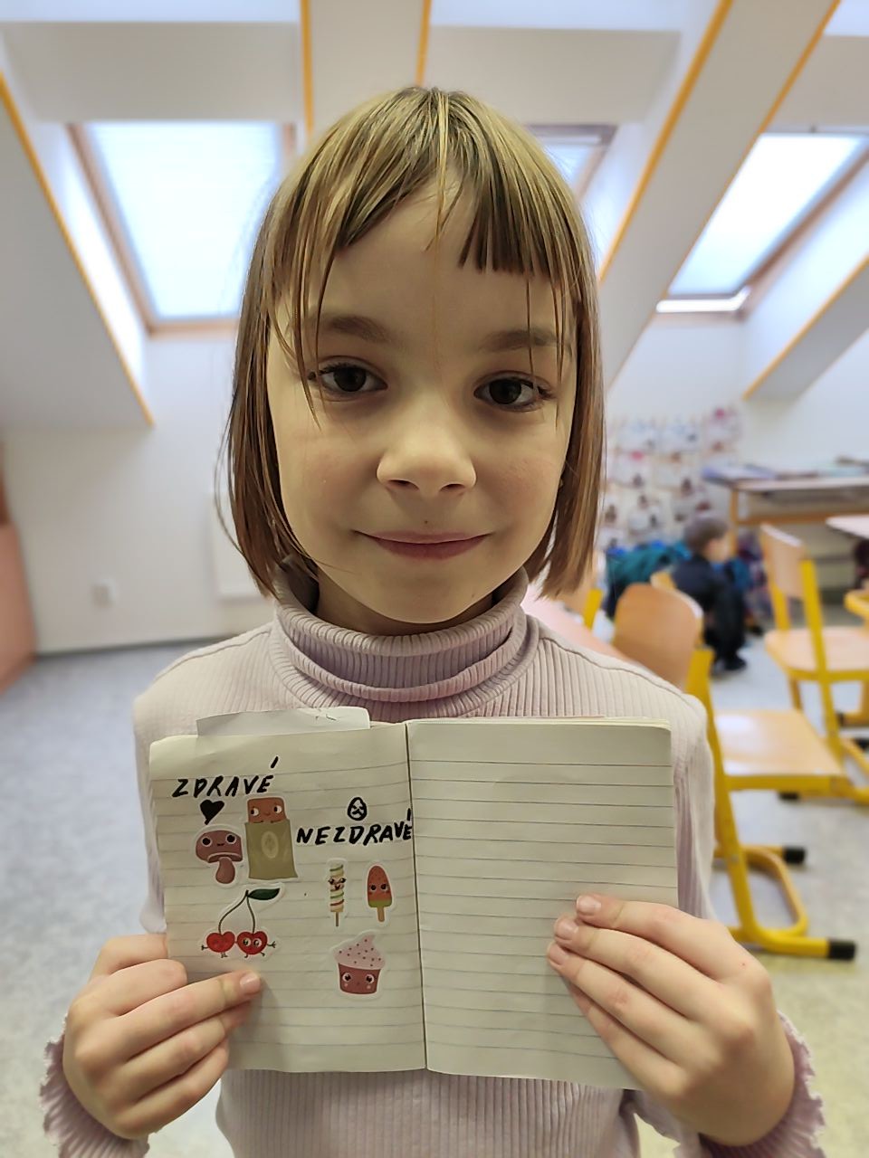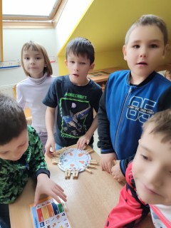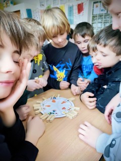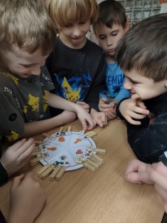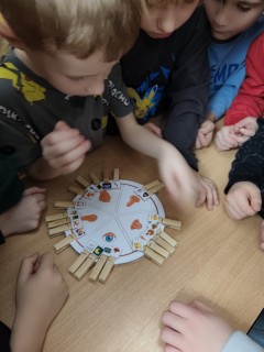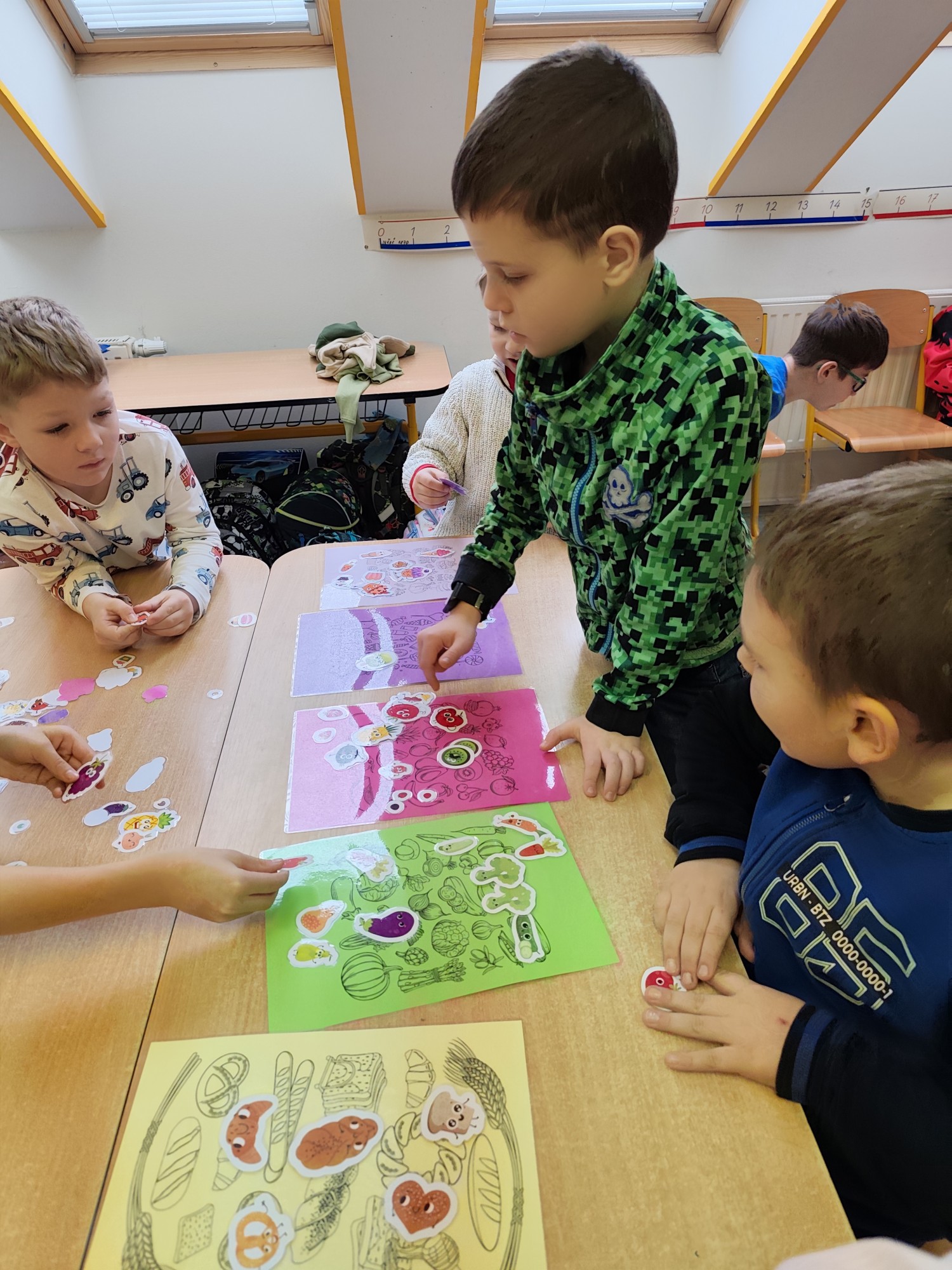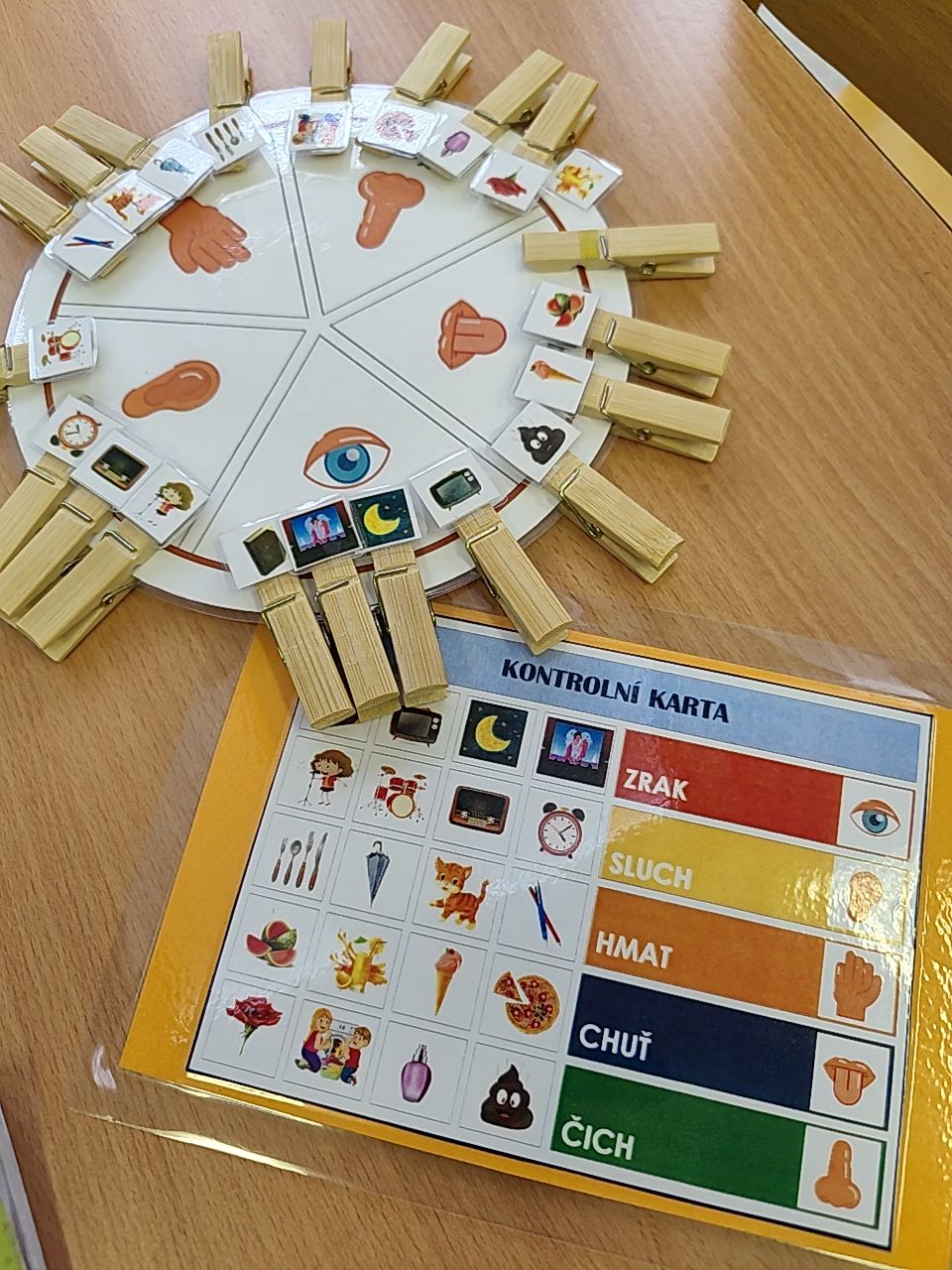 Následovala kolíčkovaná hra na smysly, při které děti podle obrázků určovaly, která činnost patří ke kterému smyslu. Aktivita podporovala spolupráci, logické myšlení i pozornost. Poté děti třídily obrázky potravin na zdravé a nezdravé, čímž si upevnily znalosti o správném stravování.