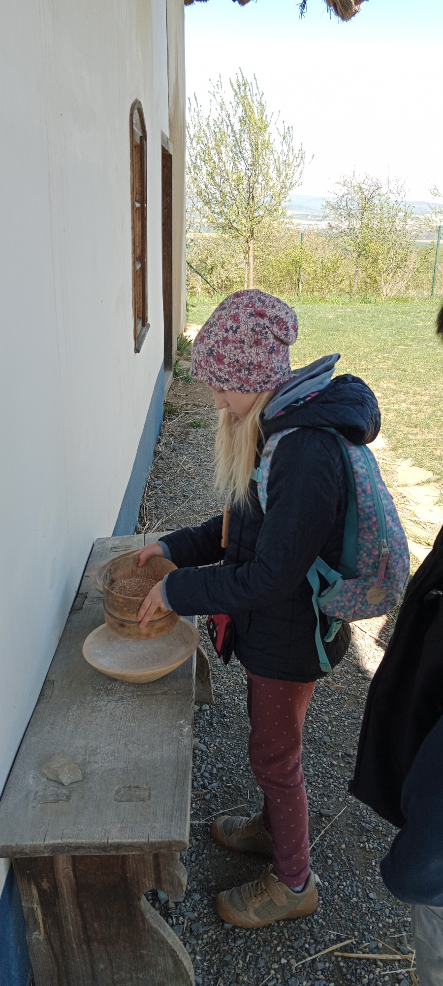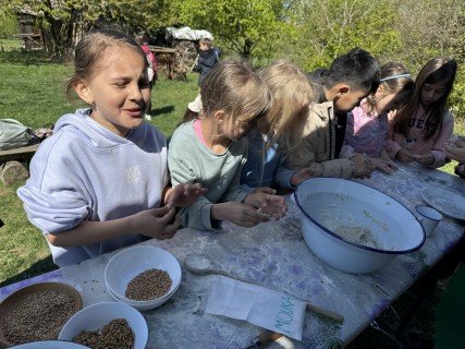 Další část programu byla věnována zpracování obilí. Žáci si vlastnoručně vyzkoušeli mletí zrna na mouku a poté z ní připravovali jednoduché placky, které se následně pekly. Mnohé překvapilo, kolik práce je potřeba, než se potraviny dostanou na náš stůl.