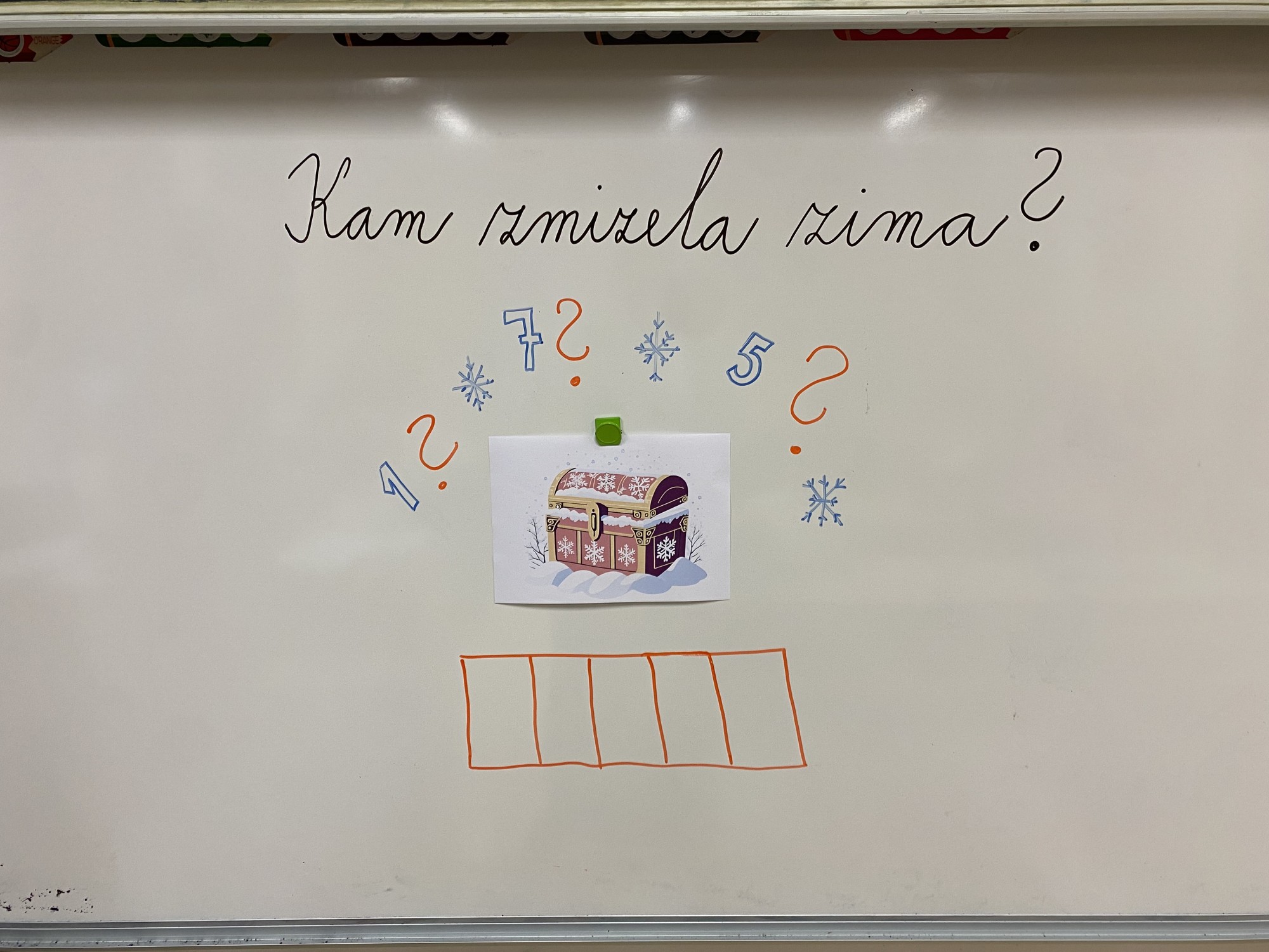 Ve vyučování jsme se s žáky prvních tříd vydali na napínavou detektivní výpravu inspirovanou pohádkovým příběhem o paní Zimě a sněžném obrovi, který jí ukradl truhlici se sněhem. Úkolem dětí bylo získat číselný kód k truhlici a paní Zimu tak zachránit.