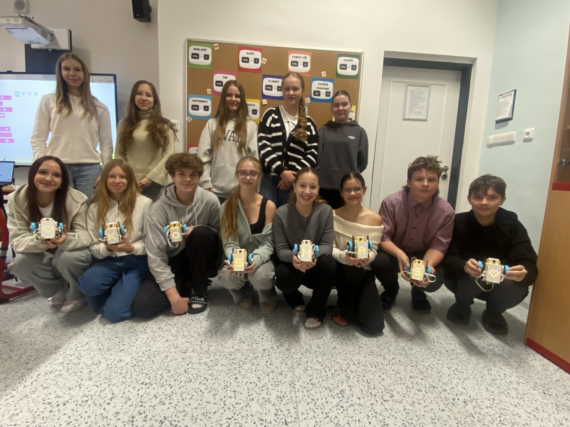 V rámci robotiky se osmáci pustili do týmové výzvy. V prostředí LEGO Spike Prime naprogramovali roboty tak, aby svítili jedno písmeno po dobu deseti sekund. Každá dvojice měla své písmeno a po seřazení robotů vznikl krásný světelný nápis KOSMAS.