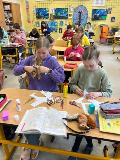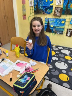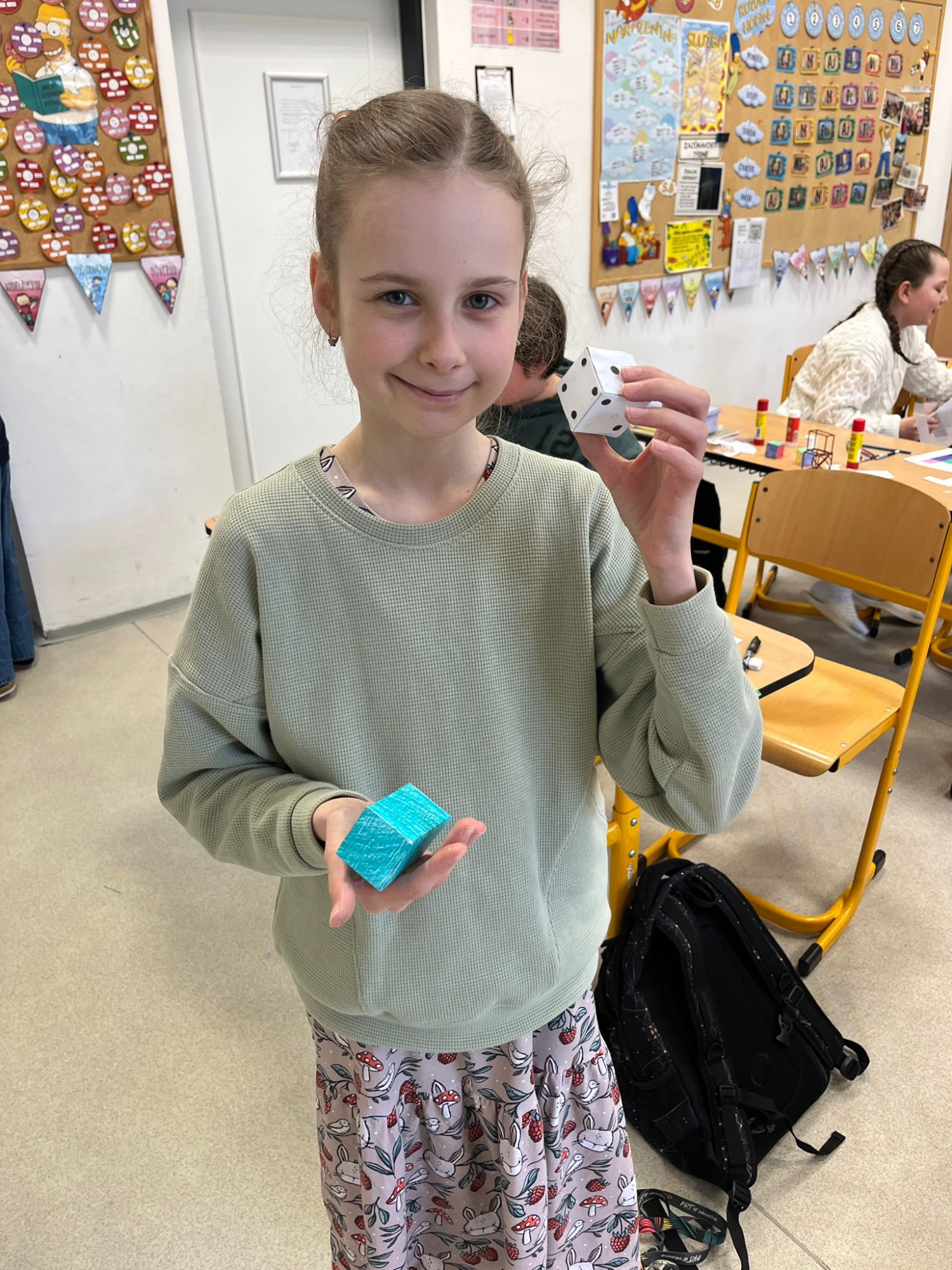 Během této praktické hodiny si děti samy vyzkoušely, jak jednotlivá tělesa vypadají v prostoru, a snadno přišly na to, kolik mají stěn, hran a vrcholů. K dispozici dostaly síť tělesa, kterou si nejprve podle vlastní fantazie pokreslily, poté vystřihly a nakonec z ní složily krychli nebo kvádr.