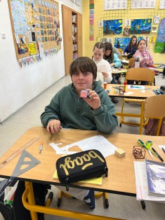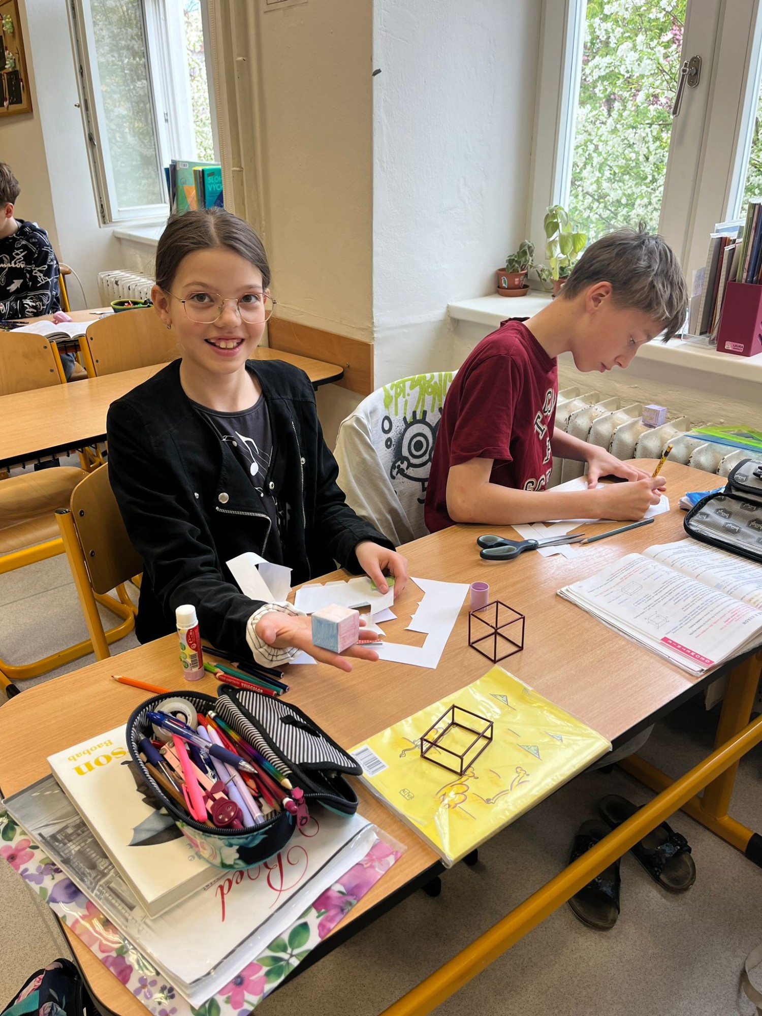 Žáci 5. B se každý čtvrtek v matematice věnují geometrii a tentokrát se ponořili do tématu geometrických těles trochu netradičně. Nejprve jsme si ukázali modely – konkrétně konstrukci krychle a kvádru – a poté jsme se rovnou pustili do práce a začali tvořit modely vlastní.
