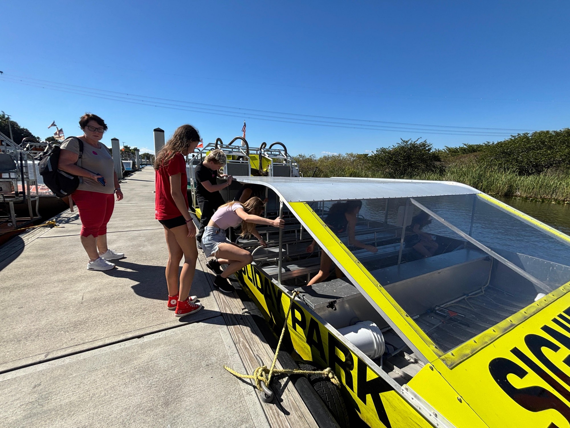 Pondělí jsme začali v národním parku Everglades, kde jsme se vydali na projížďku mezi mangrovy a vodními kanály. Viděli jsme aligátory, želvy i nespočet druhů ptáků, kteří jsou pro tuto oblast typičtí. Odpoledne jsme se přesunuli do jednoho z největších nákupních center v USA – Sawgrass Mills. Obrovská nabídka obchodů nám dala možnost pořídit si suvenýry i módní kousky. Večer nás čekal sportovní vrchol – hokejový zápas NHL. Atmosféra byla elektrizující a největším překvapením se stal okamžik, kdy se na středové kostce objevil pozdrav přímo naší škole.