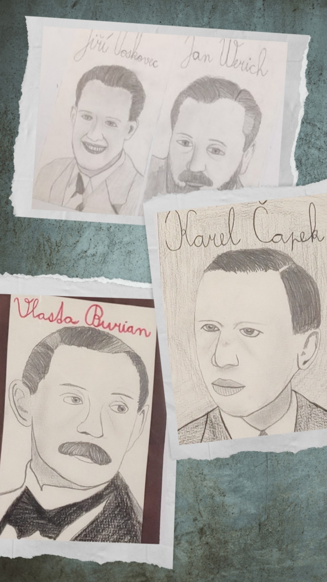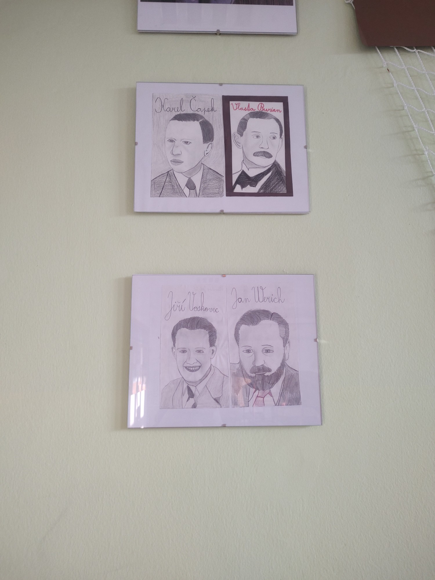Žák Stanislav Jež ze třídy 6.C se postaral o krásné oživení učebny literatury. Nakreslil portréty 4 významných osobností české kultury – Jiřího Voskovce, Jana Wericha, Karla Čapka a Vlasty Buriana.