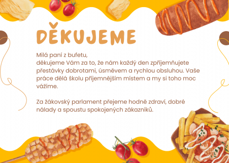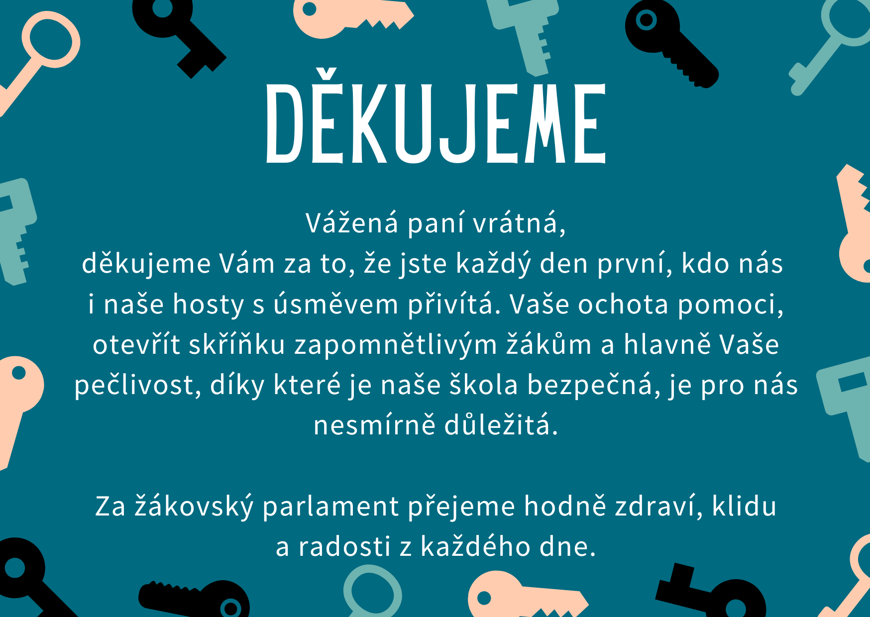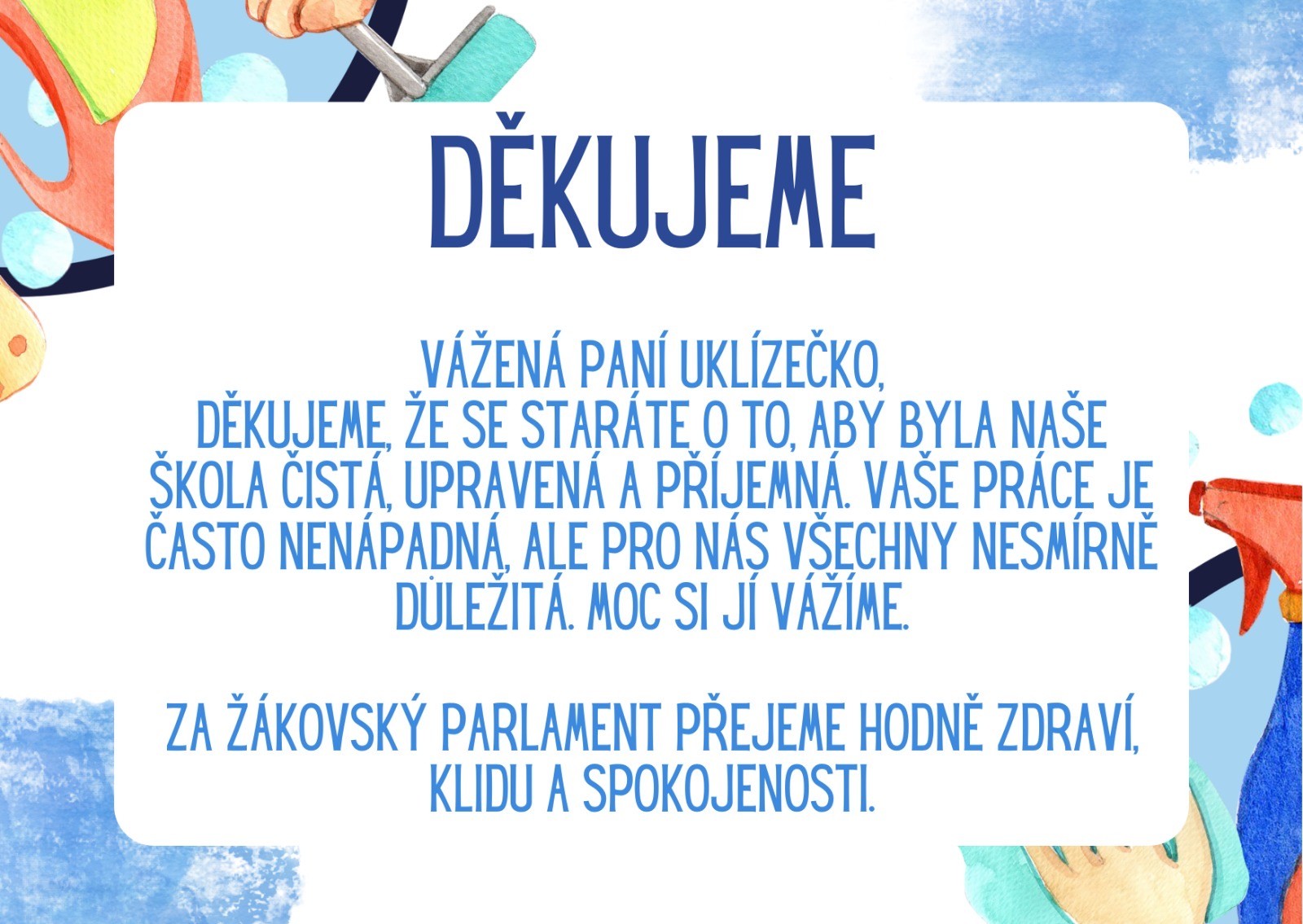 Jménem žákovského parlamentu bychom chtěli poděkovat správním zaměstnancům školy za jejich práci, které si velmi vážíme. Všichni jsou nezbytnou součástí naší školy a bez nich bychom si nevěděli rady v různých situacích. Proto žákovský parlament vytvořil děkovné kartičky pro pana školníka, paní uklízečky, paní kuchařky, paní vrátnou, paní hospodářku a v neposlední řadě pro paní z bufetu.