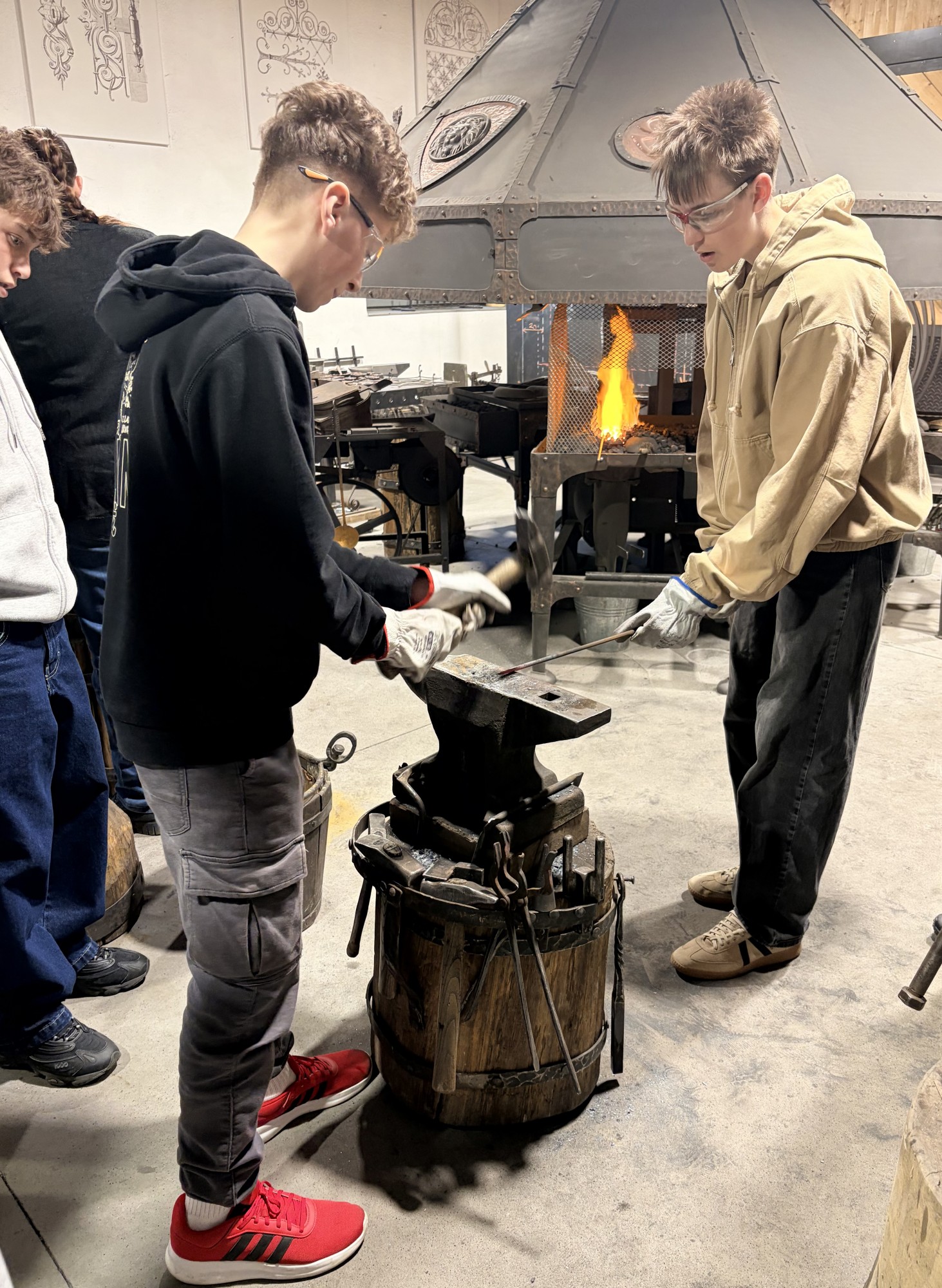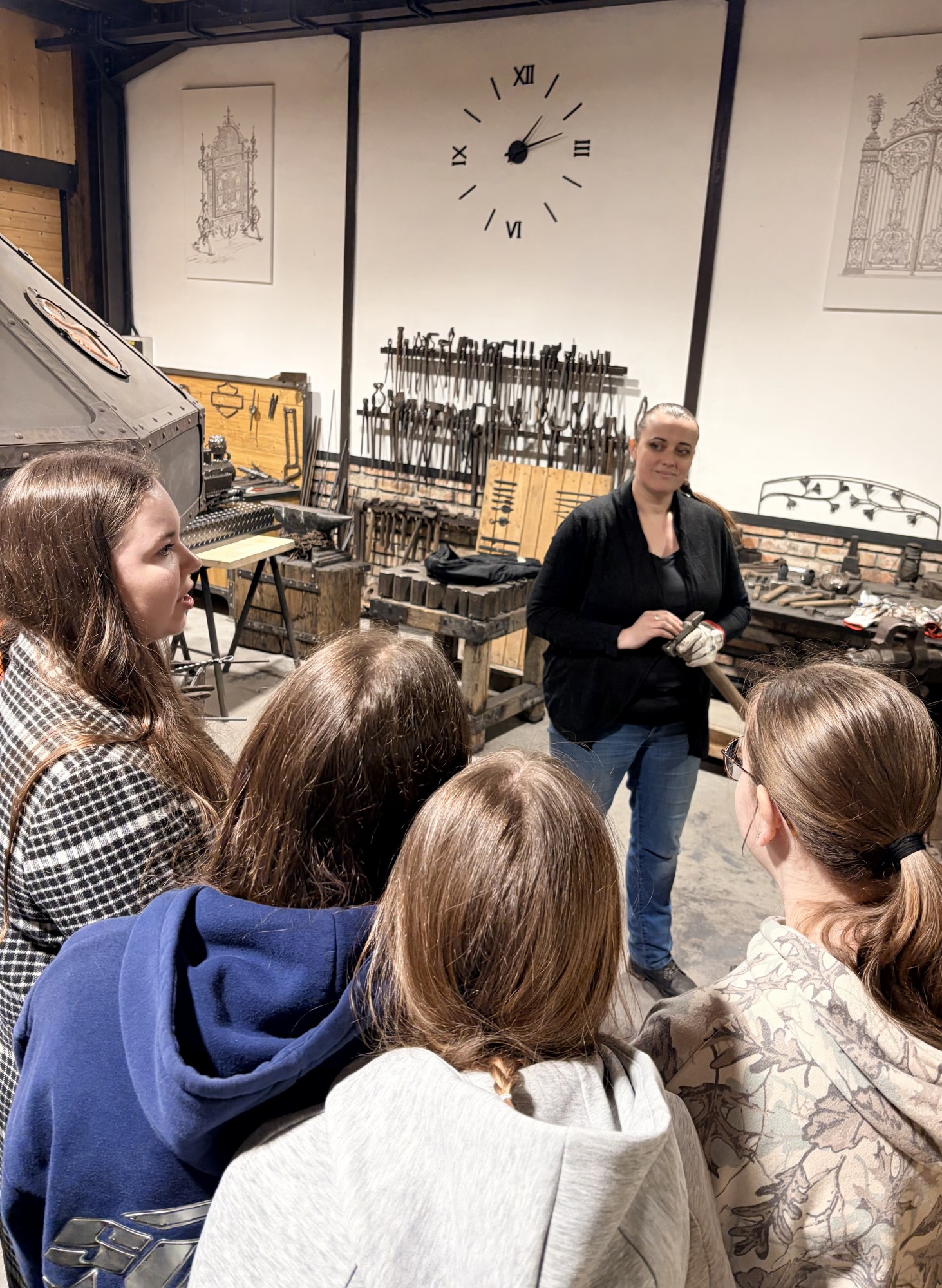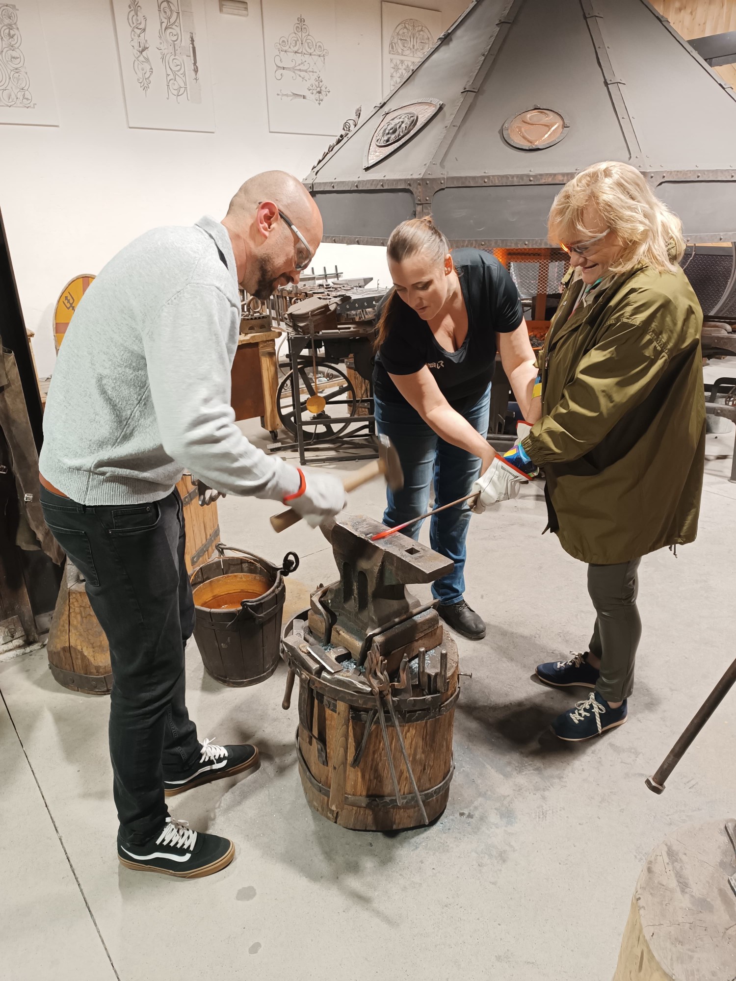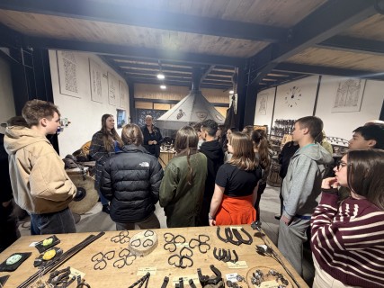 Hned potom jsme zamířili do kovárny, kde nám kovářka povyprávěla spoustu zajímavostí o svém řemesle. Pak už si to žáci mohli vyzkoušet na vlastní kůži – ve skupinkách vyráběli hřebík ze surového materiálu, což pro ně byla zábava. A nejen pro žáky – hřebík si zkusili vyrobit i učitelé ze Španělska. Někteří žáci pak využili možnost vyzkoušet si brnění nebo meče.
