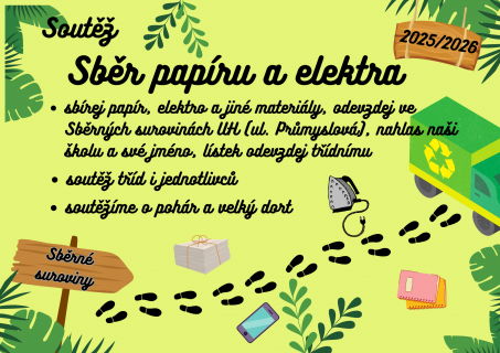 od 1. září (2025) do 6. června (2026) se naše škola opět zapojí do ekologické soutěže vyhlášené Sběrnými surovinami v Uherském Hradišti ve sběru papíru, elektra a kovů s názvem Ekosoutěž s Rudou Sběrňáčkem.