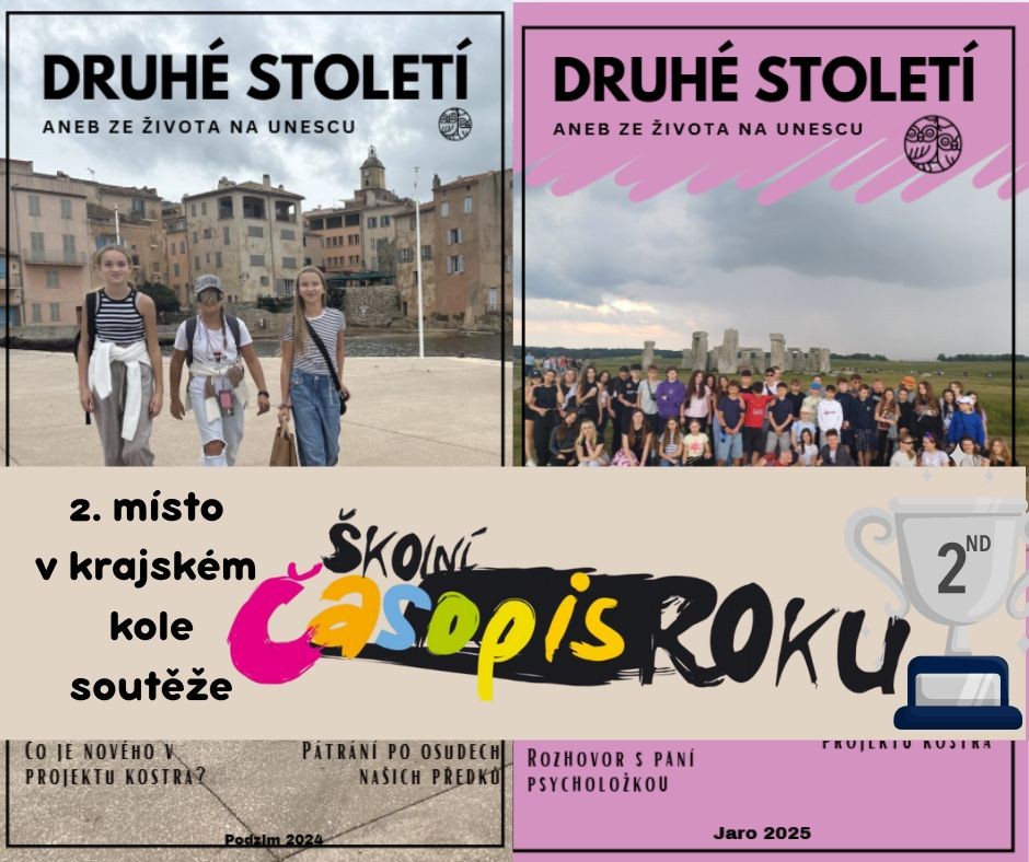 I v letošním roce se koná soutěž Školní časopis roku, do které se mohou zapojit žáci základních a středních škol vydávající vlastní školní časopis. Náš časopis Druhé století v krajském kole soutěže získal krásné 2. místo a postupuje do celostátního kola, které se uskuteční 21. listopadu 2025 v Brně. Z úspěchu má celá školní redakce obrovskou radost. Držte nám palce!