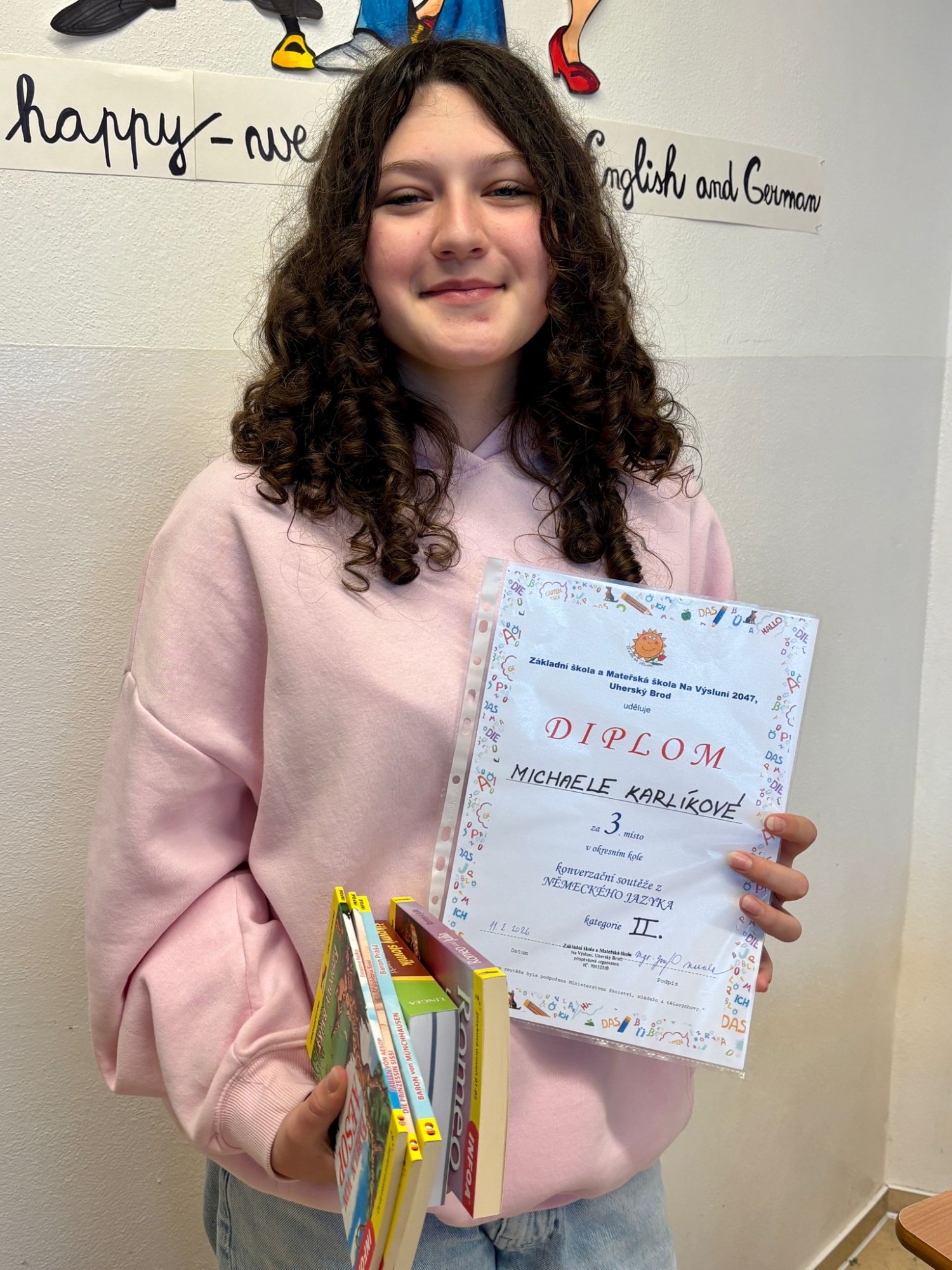 Naše žákyně Michaela Karlíková z 9.C se ve středu 11. 2. zúčastnila okresního kola olympiády v německém jazyce, které se konalo na Základní škole Na Výsluní v Uherském Brodě. Se svými znalostmi a jazykovými dovednostmi si vedla skvěle a obsadila výborné 3. místo!