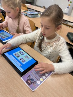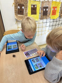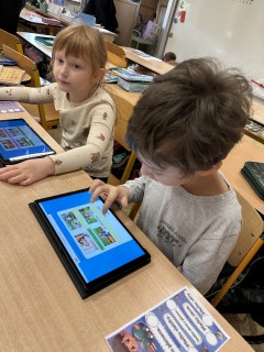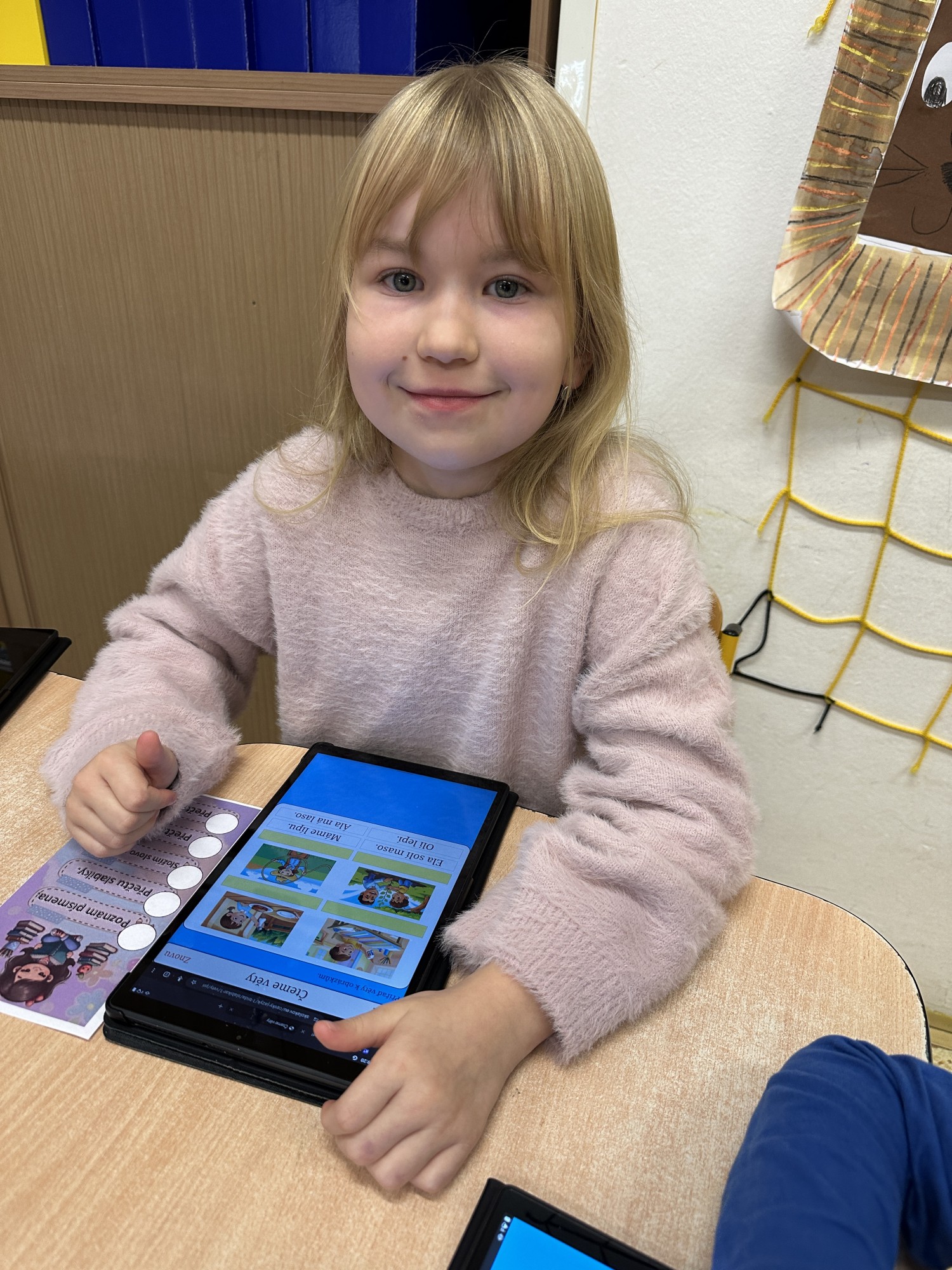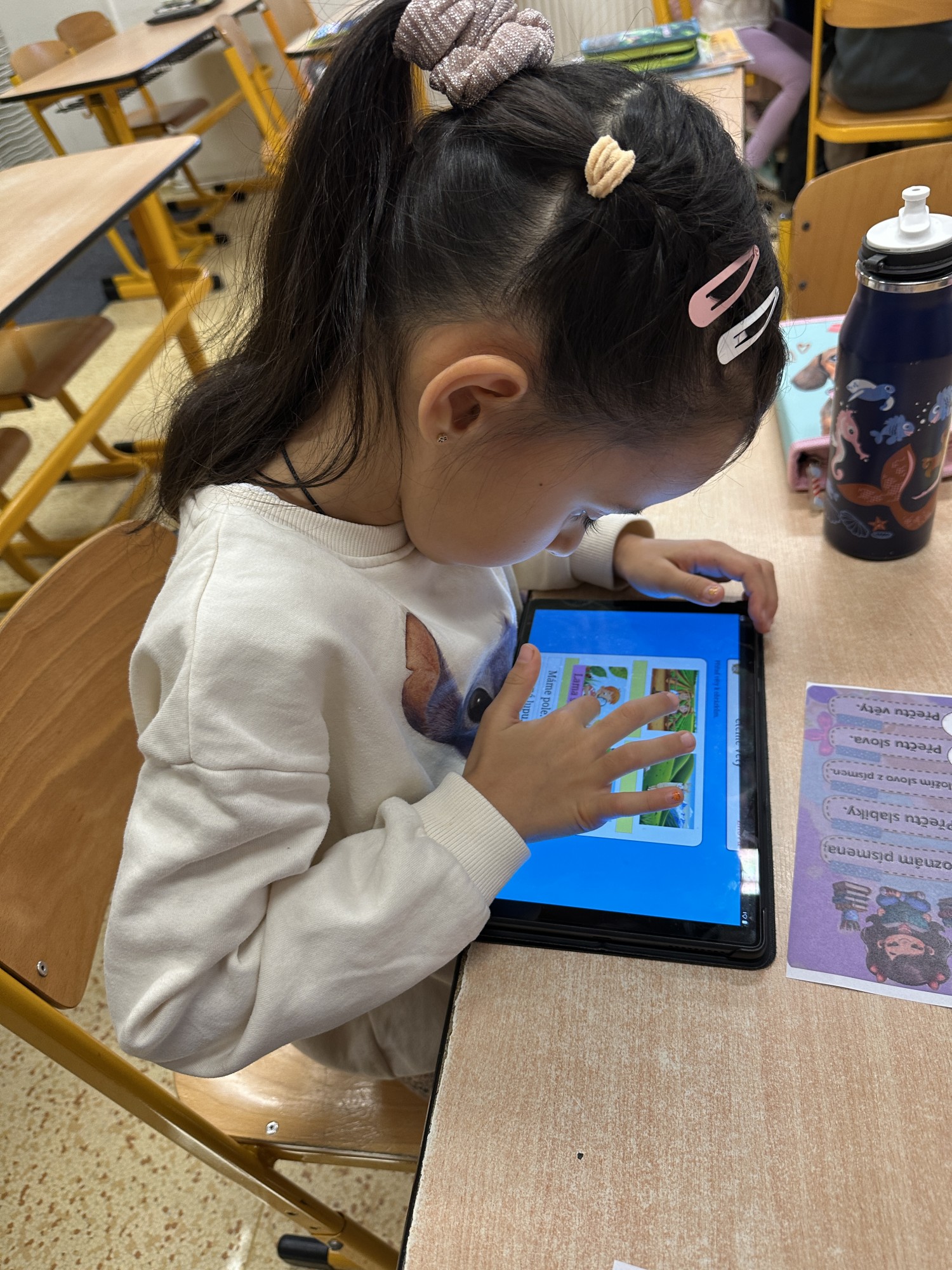 - Práce na tabletu – prvňáčci si poprvé vyzkoušeli jednoduché interaktivní úkoly, které je nejen bavily, ale zároveň rozvíjely jemnou motoriku i čtenářské dovednosti.
