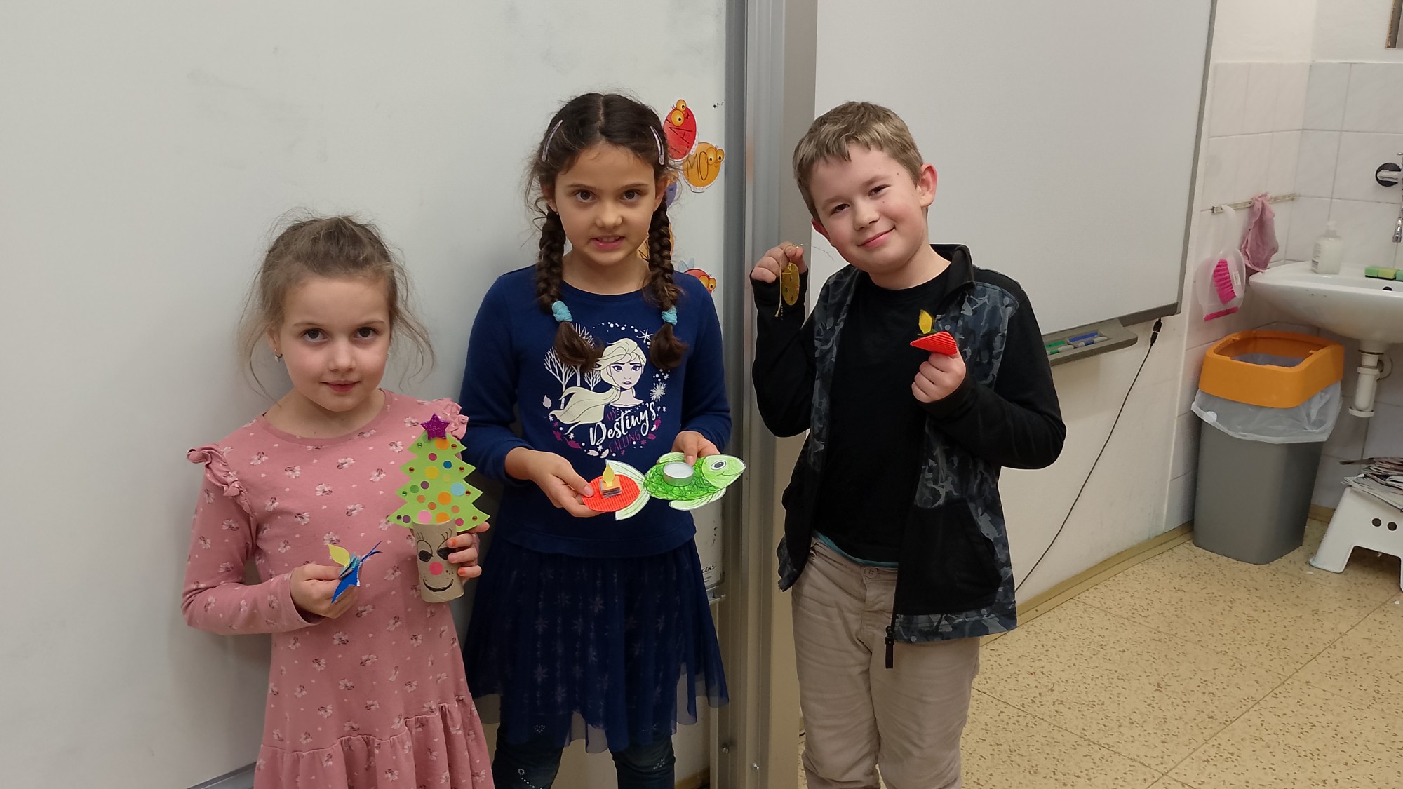 Paní vychovatelky měly pro děti připravené veškeré potřebné materiály a pomáhaly jim s výrobou. Děti si s nadšením a elánem vyráběly například třpytivé baňky jako ozdoby na vánoční stromeček, korálkové spirály, vánoční masky nebo svícen s kapříkem.