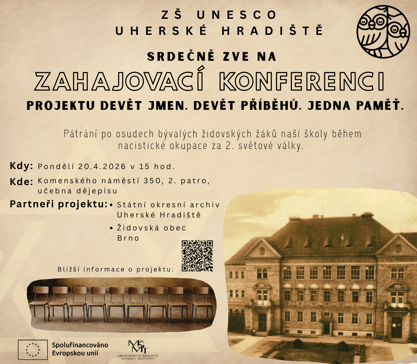 V pondělí 20. dubna od 15 hodin proběhla na ZŠ UNESCO zahajovací konference projektu Devět jmen. Devět příběhů. Jedna paměť., který se věnuje pátrání po osudech devíti židovských žáků naší školy z období druhé světové války. Projekt vzniká ve spolupráci se Státním okresním archivem v Uherském Hradišti a jeho cílem je připomenout konkrétní lidské příběhy, které byly násilně přerušeny během holocaustu.